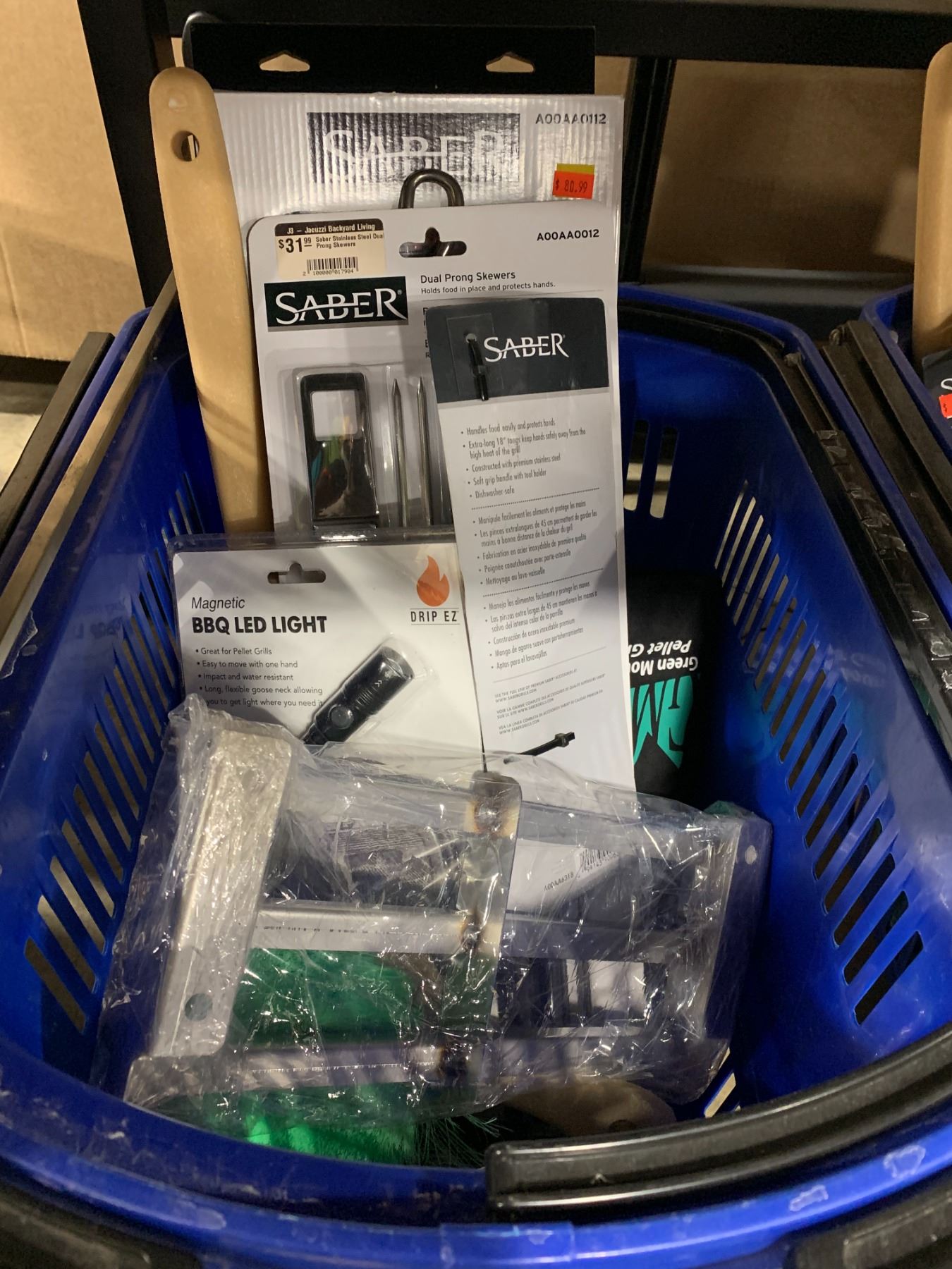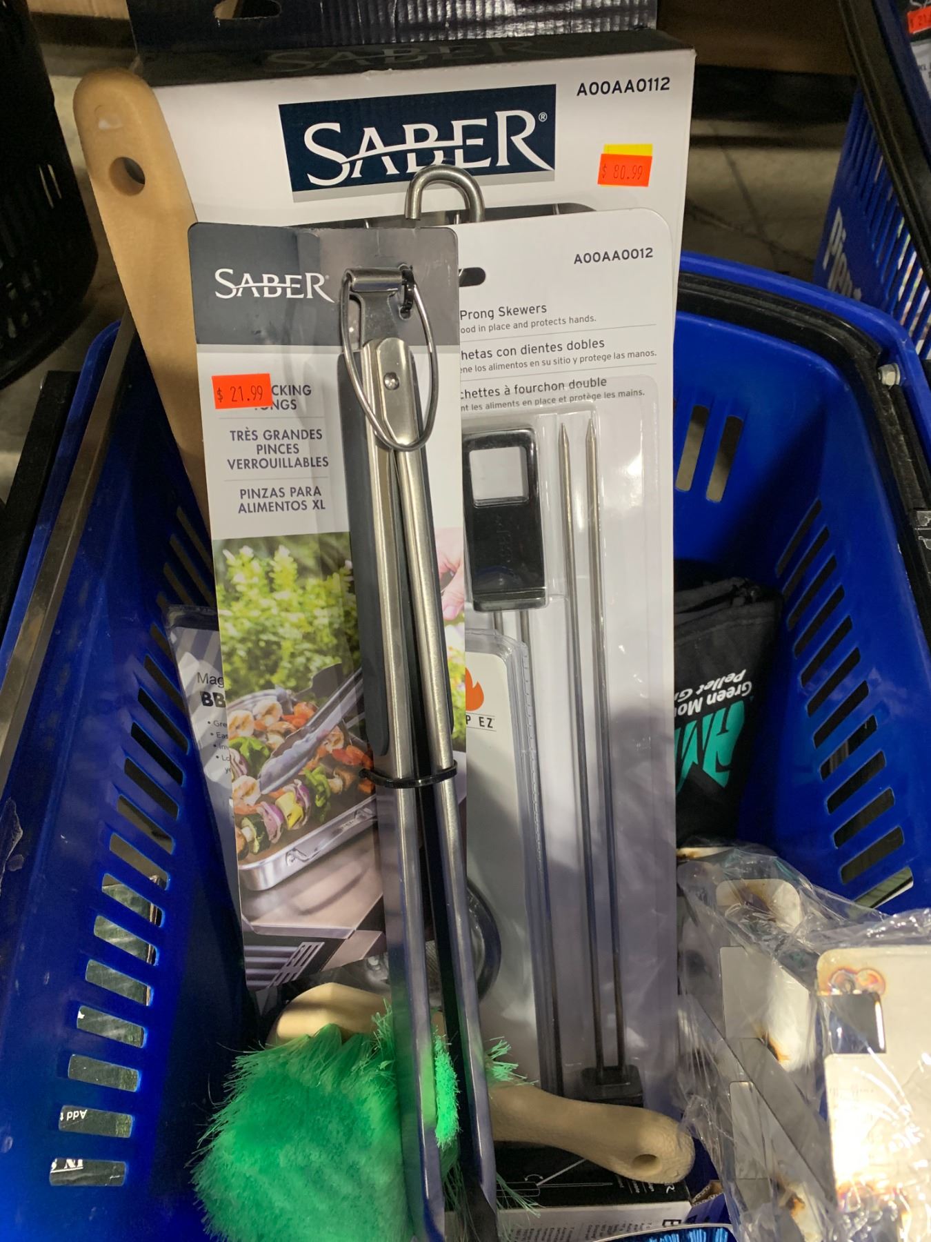 SABER LOT INCLUDING; 3 PC PREMIUM TOOL SET, INDUSTRIAL STRENGTH GRILL BRUSHES, DUAL PRONG SKEWERS, XL LOCKING TONGS, GREEN MOUNTAIN GRILLS OVEN MITTS, GREEN MOUNTAIN GRILL THIN SMOKER & SCRUB BRUSH