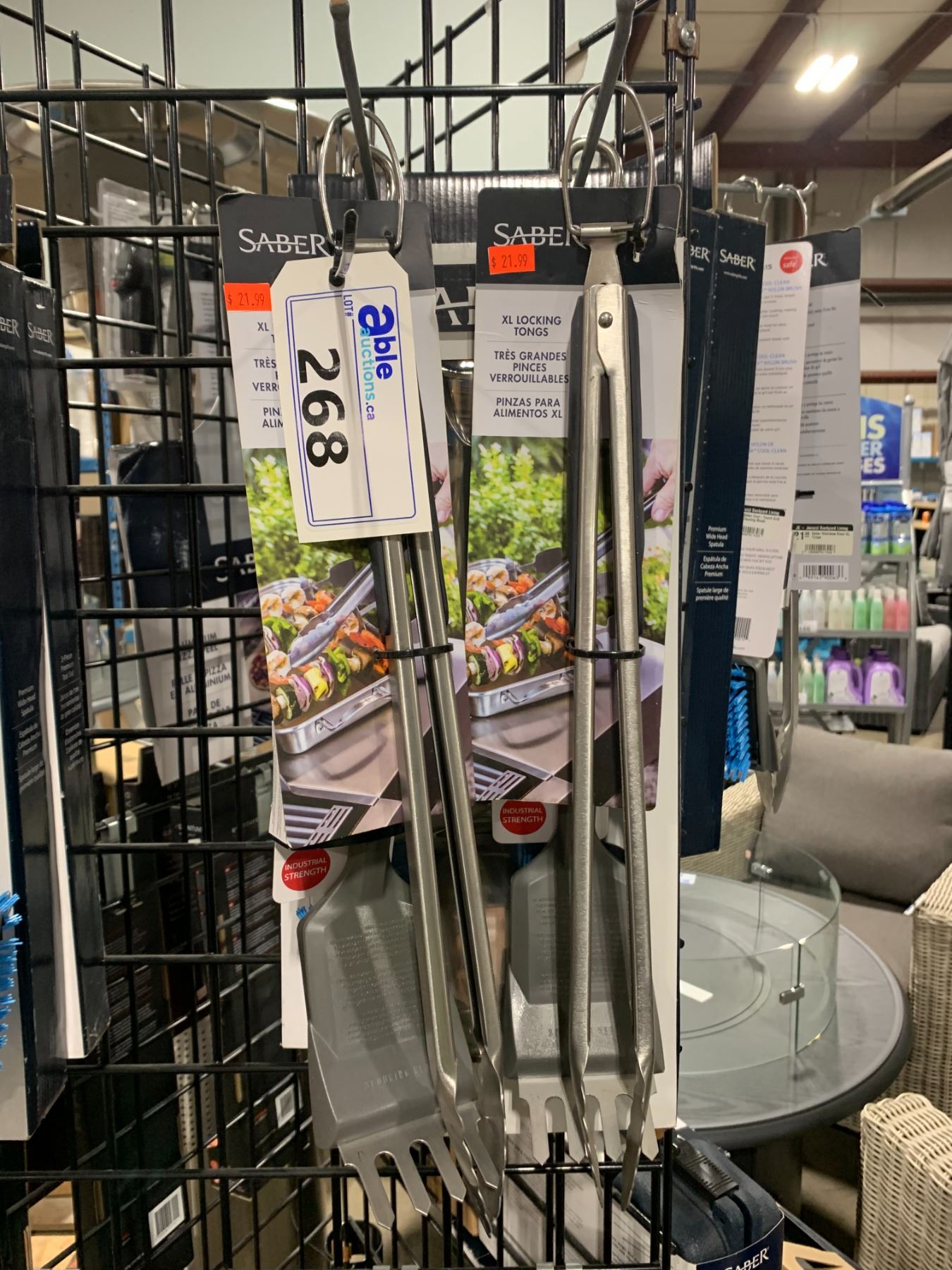 SABER LOT INCLUDING; 3 PC PREMIUM TOOL SET, PREMIUM WIDE HEAD SPATULA, 2 INDUSTRIAL STRENGTH GRILL BRUSHES, & PAIR OF XL LOCKING TONGS