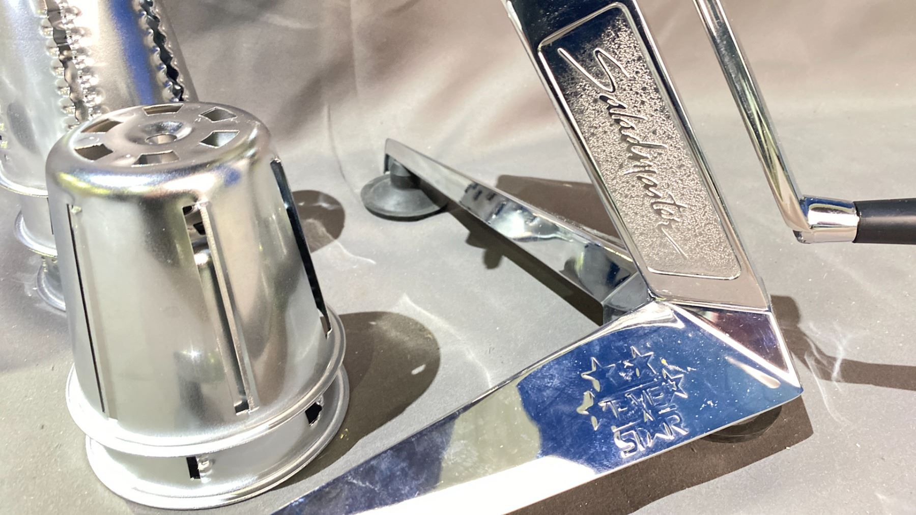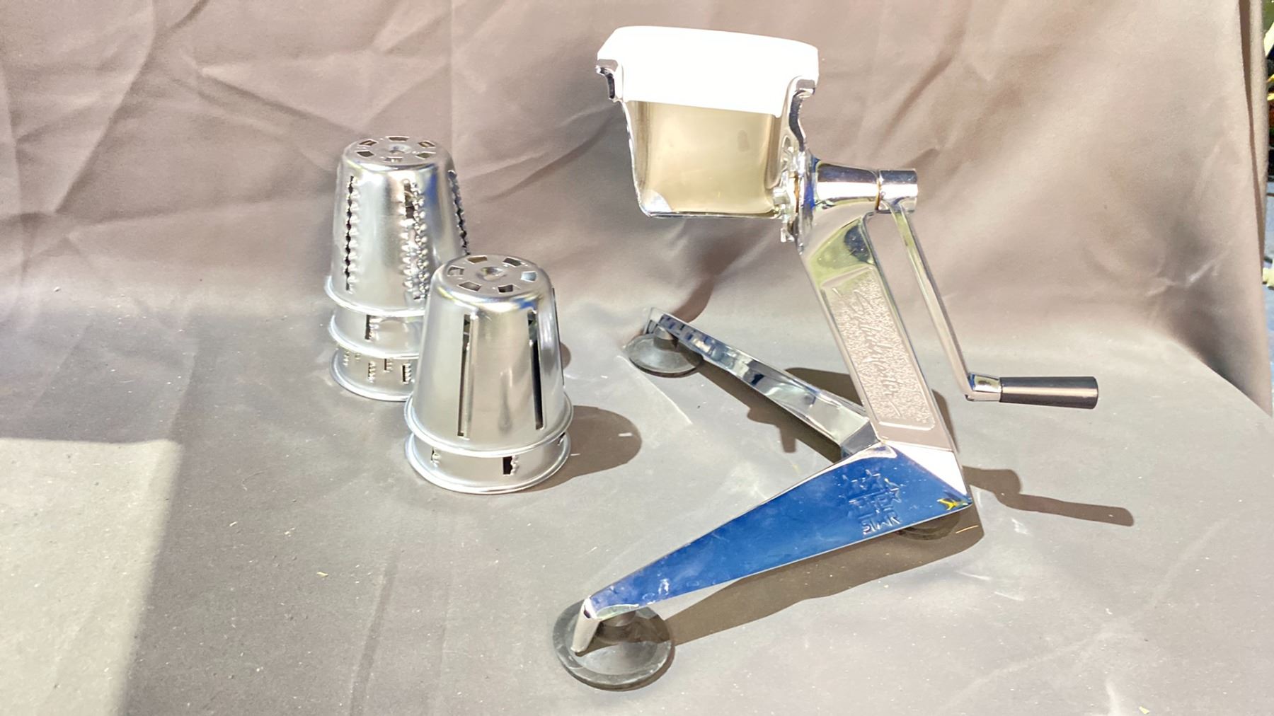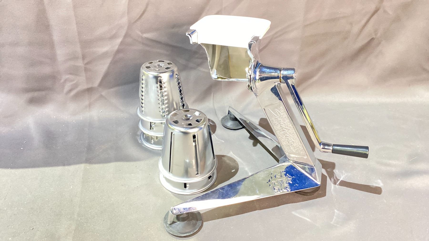 SALADMASTER MANUAL HAND CRANK FOOD PROCESSOR/SHREDDER W/SET OF 5 CONE ATTACHMENTS