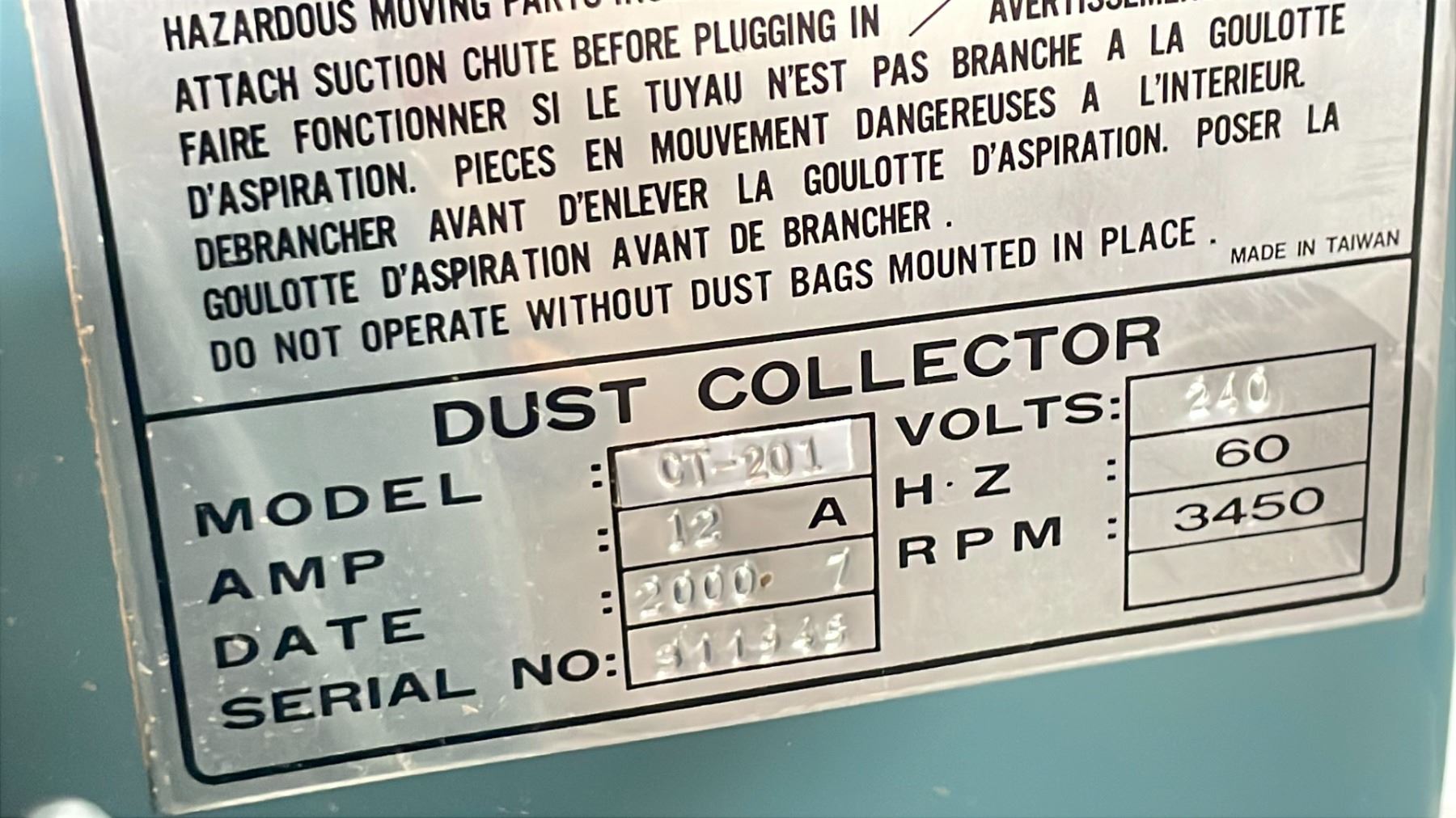 SAMONA INDUSTRIAL AIR CLEANER MODEL # 0T-201 SERIAL #311945