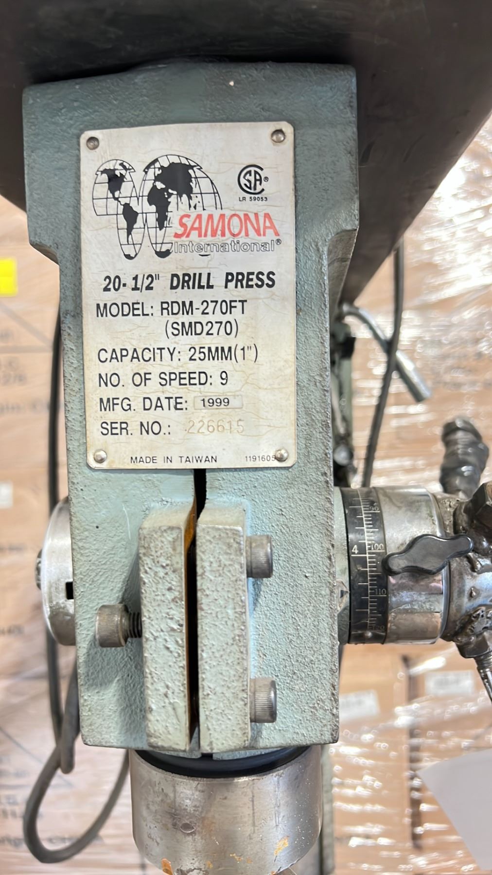 SAMONA RDM-270FT 20-1/2" ELECTRIC INDUSTRIAL DRILL PRESS, SERIAL. 226615 25MM, 9 SPEED, MFG 1999, 1150/230V, 60HZ, 1720RPM, SINGLE PHASE, *ITEM LOCATED OFFSITE, 19757 LANGLEY*