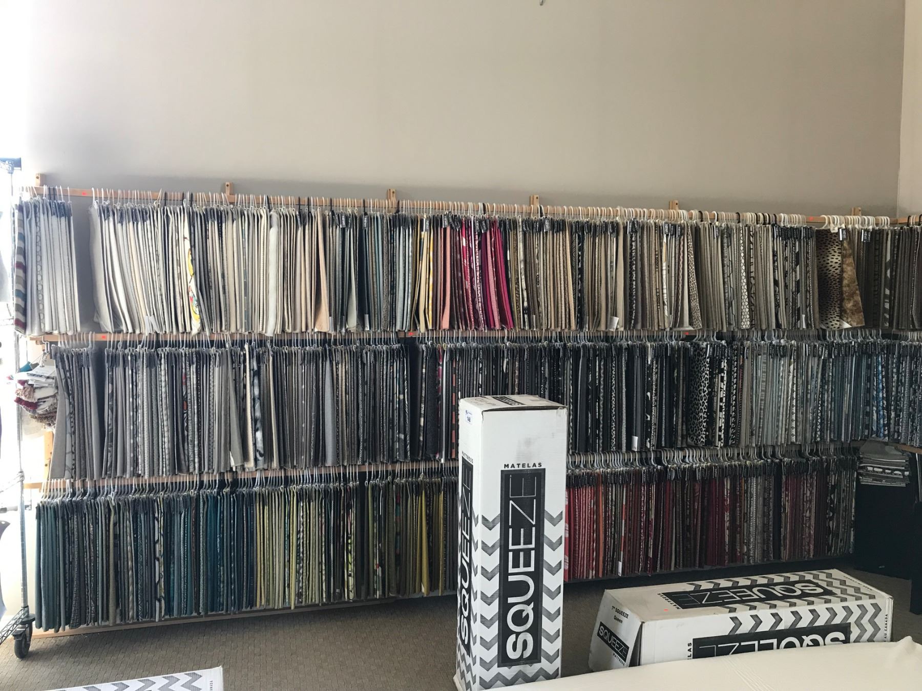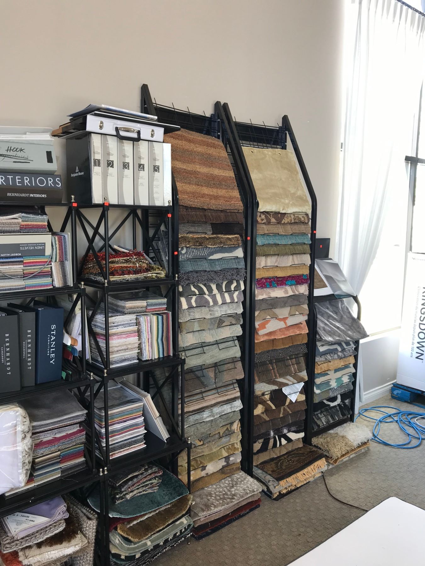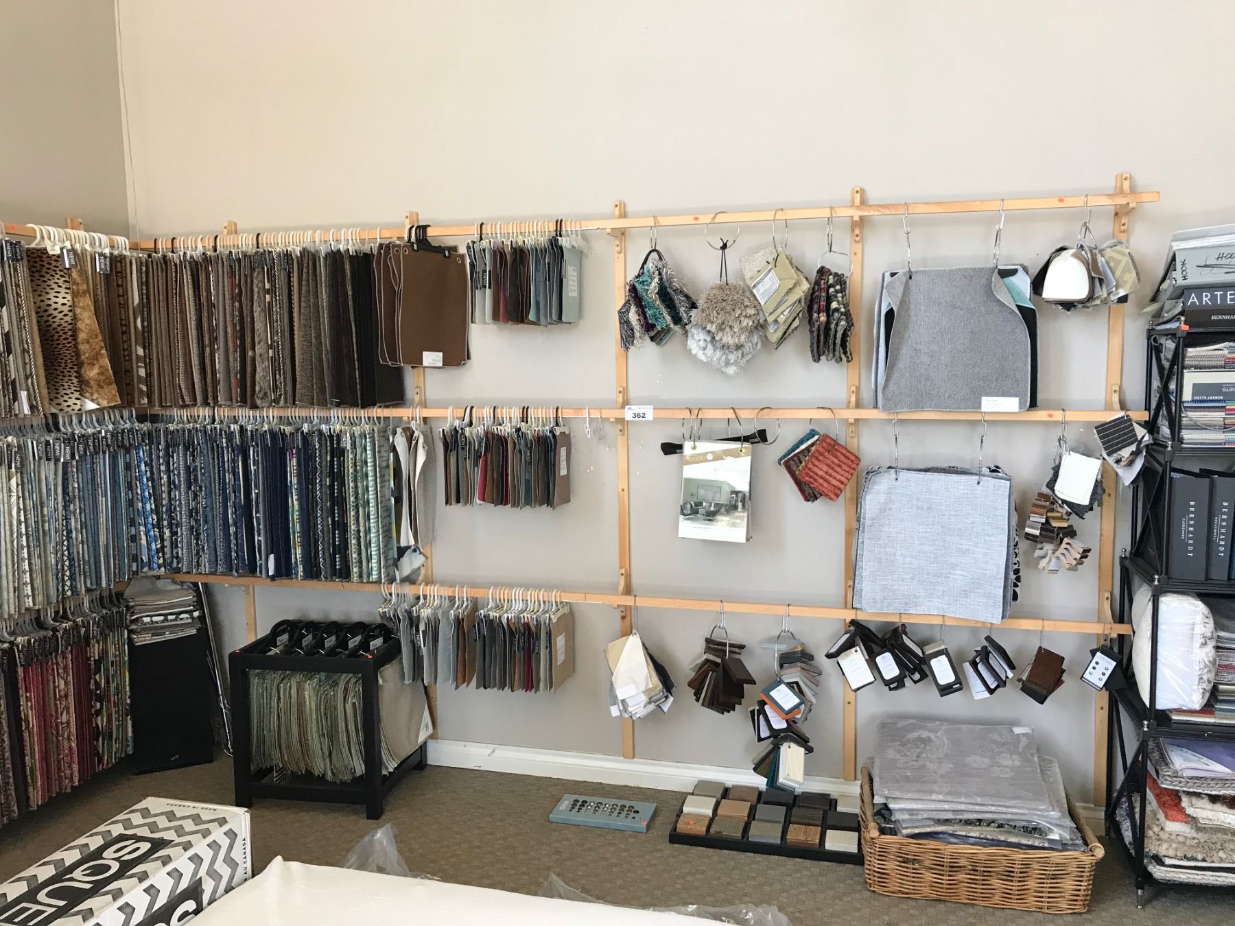 SAMPLE WALL OF RACKING, SHELVING & DISPLAYS WITH ASSORTED FABRIC, WOOD & CARPET SAMPLES
