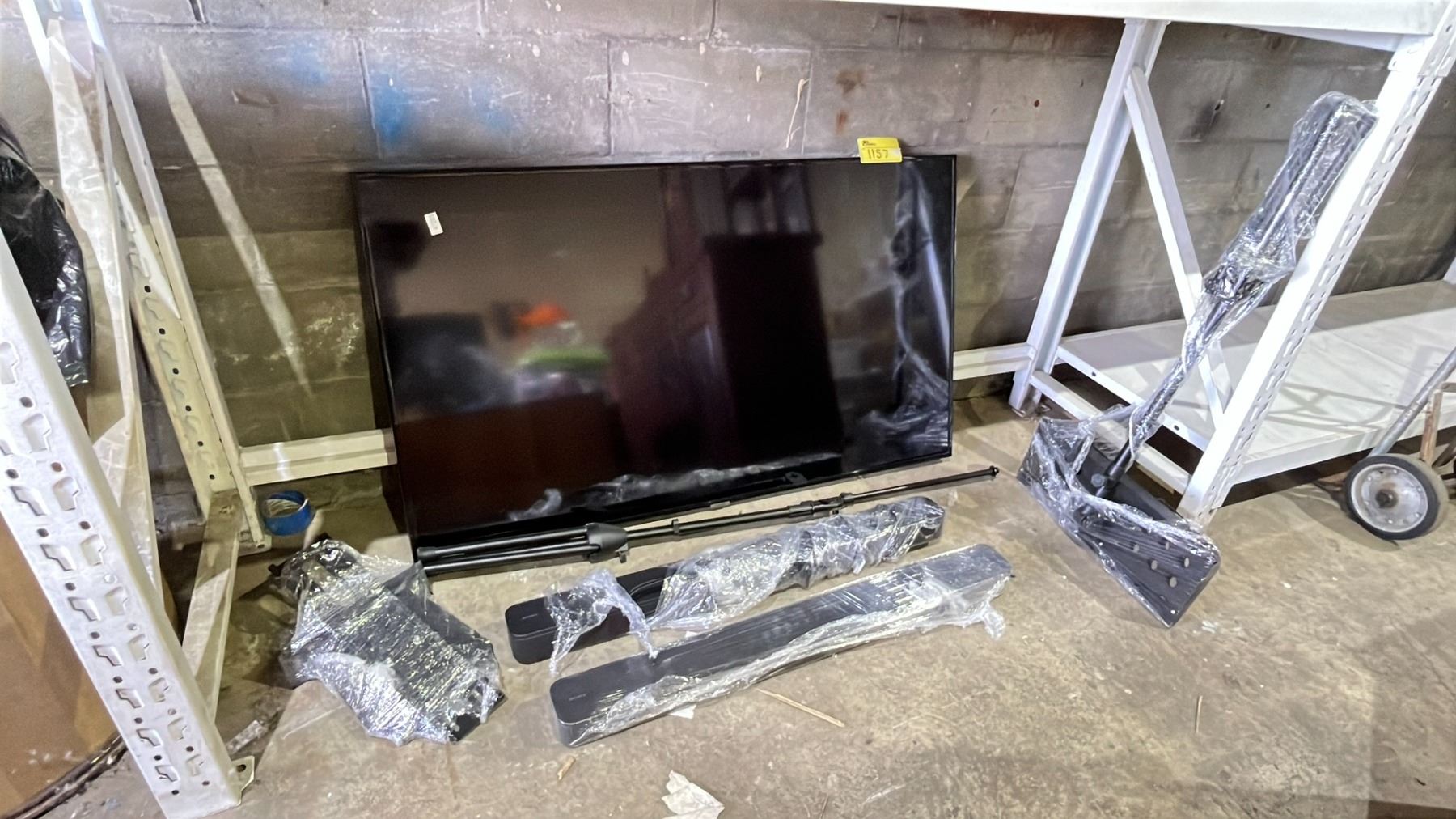 SAMSUNG 55" SMART TV, 2 SONY SOUNDBARS & 2 TV TRIPODS - *NO POWER CABLE/WORKING CONDITION UNKNOWN*