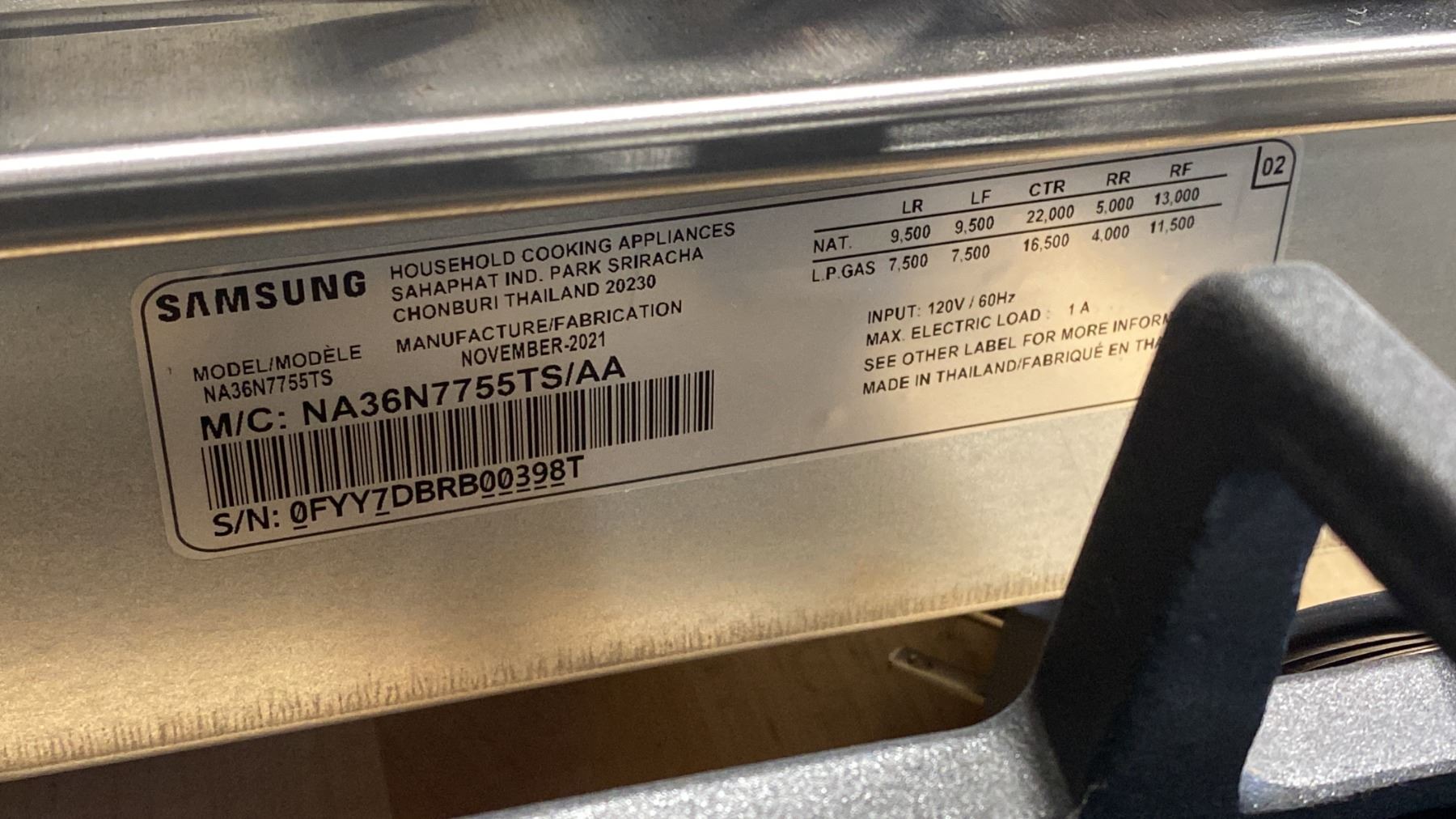 SAMSUNG MODEL NA36N7755TS. STAINLESS STEEL 36" 5 BURNER SMART GAS COOKTOP SN 0FYY7DBRB00398T RETAIL PRICE $2,299.99