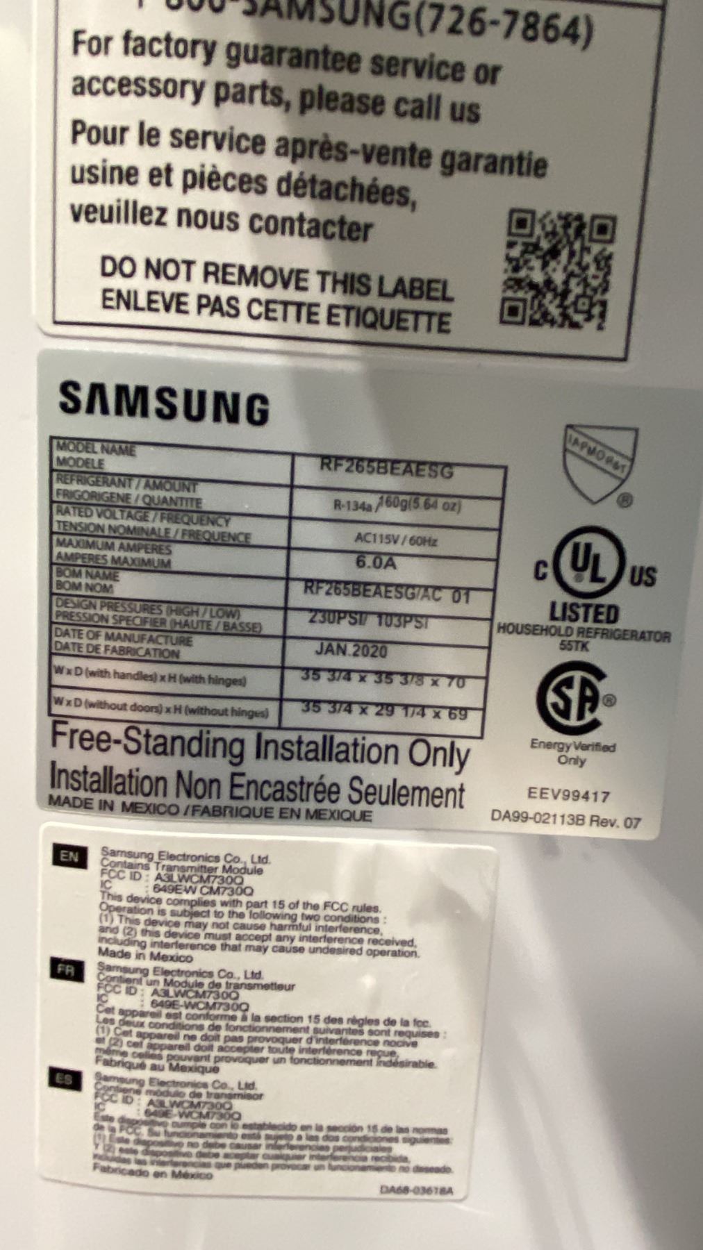 SAMSUNG MODEL RF265BEAESG/AC. 36" STAINLESS STEEL FRENCH DOOR SMART REFRIGERATOR WITH FOUR TYPES OF ICE MAKER & WATER DISPENSER SN0AX14BBN100052 RETAIL PRICE $4999.00