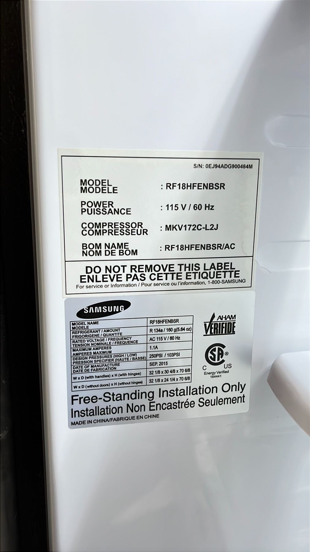 SAMSUNG RF18HFENBSR 32"W STAINLESS STEEL DOUBLE DOOR BOTTOM FREEZER REFRIGERATOR