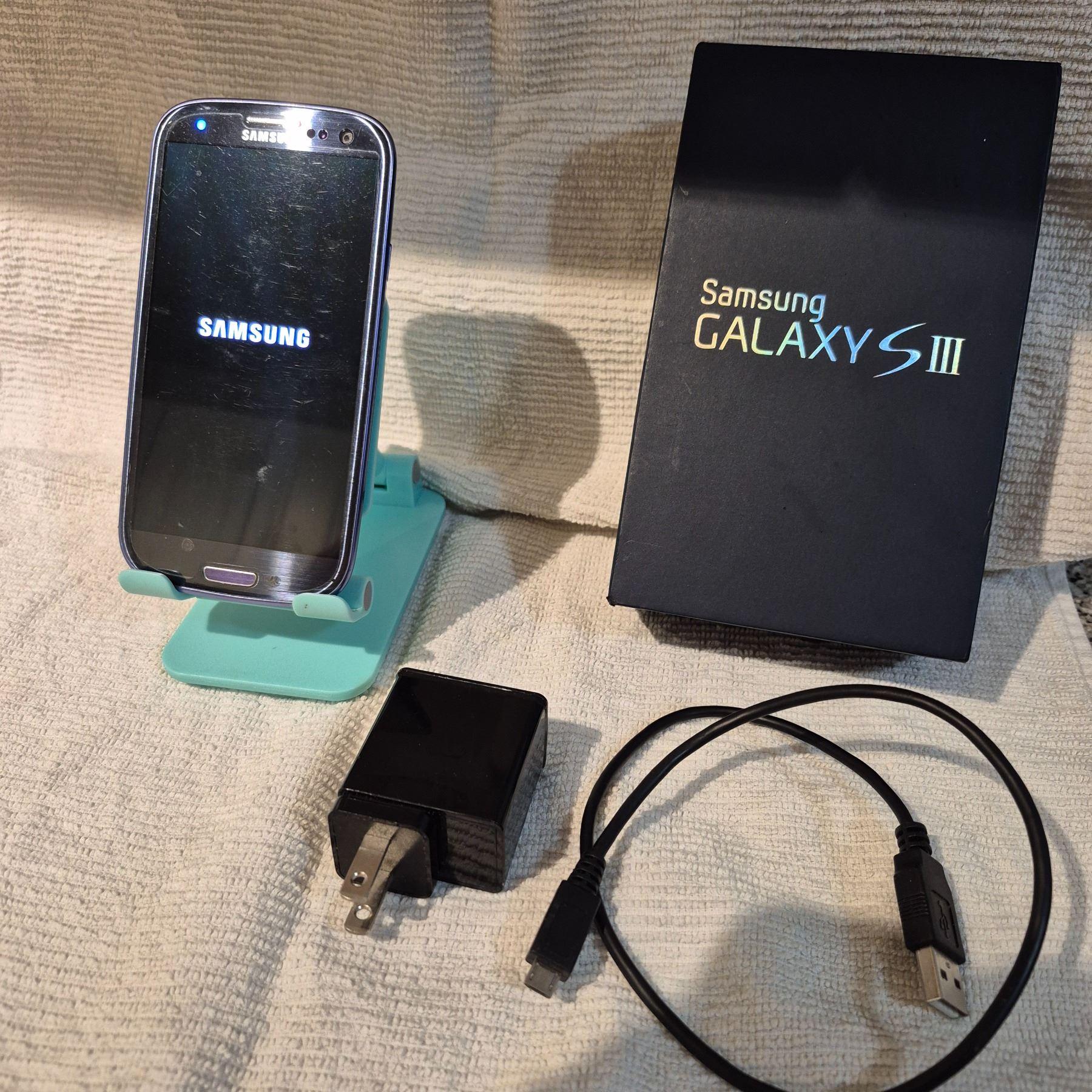 SAMSUNG S3 SMARTHPONE WITH BOX, MANUAL, CHARGER - TESTED WORKING, UNKNOWN NETWORK
