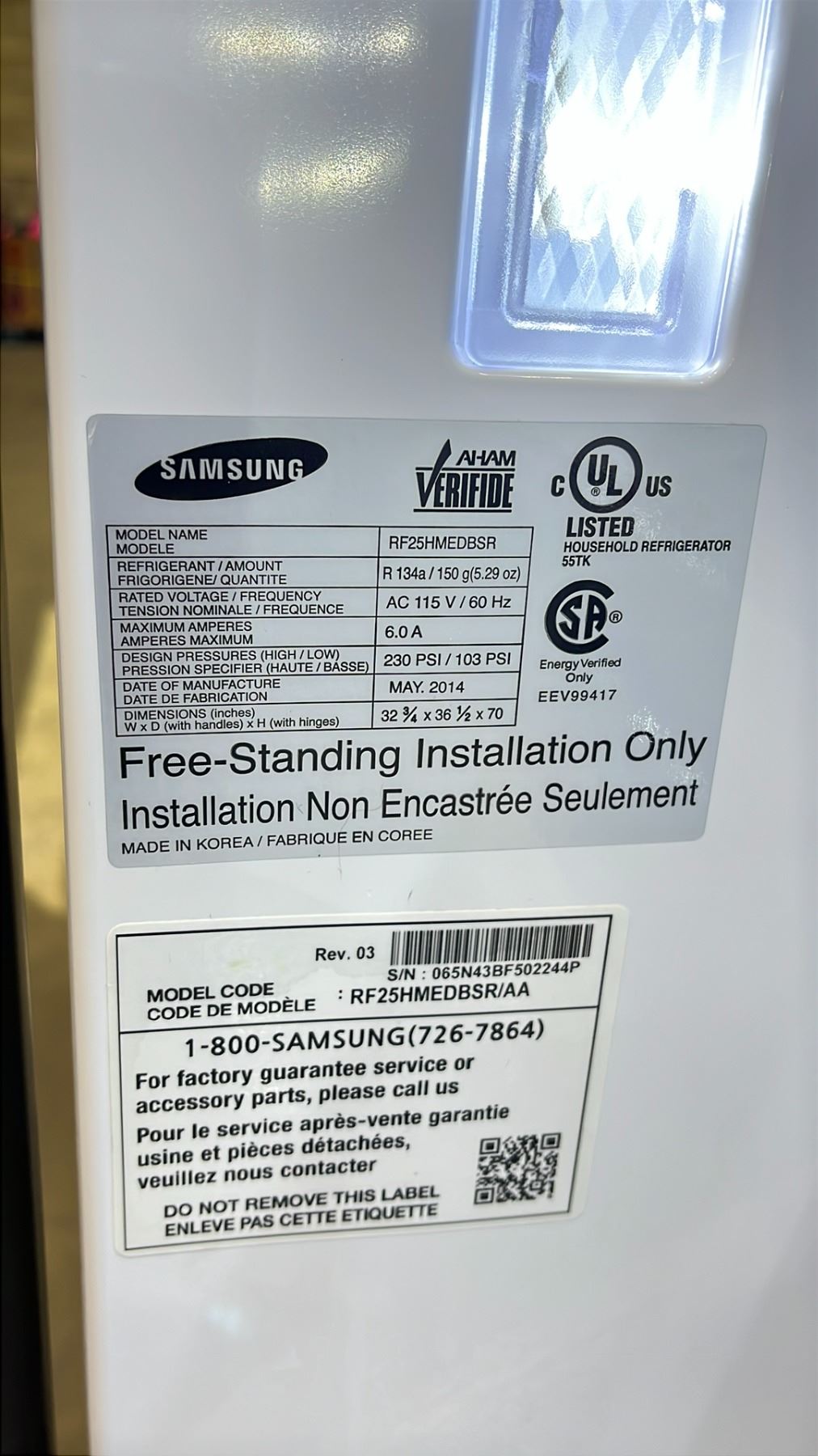 SAMSUNG STAINLESS STEEL RF25HMEDBSR 33"W REFRIGERATOR