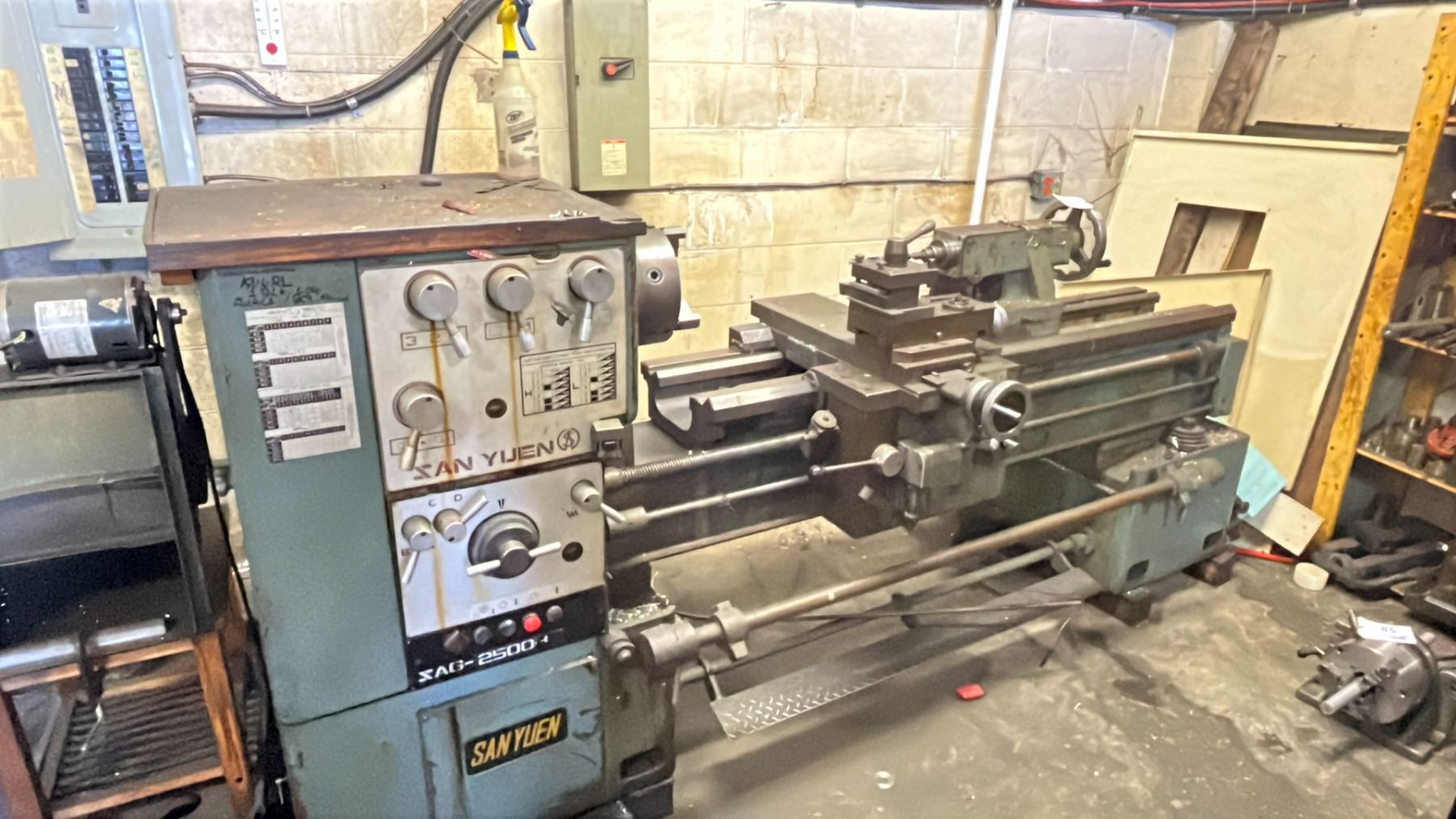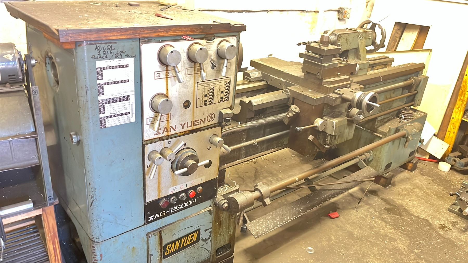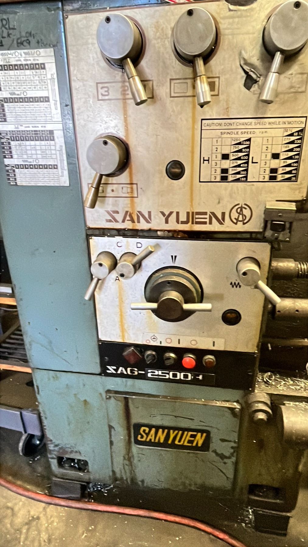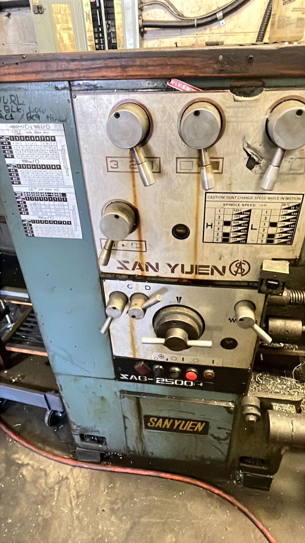 SAN YUEN SAG 2500H METAL LATHE 230/3 PHASE 4 JAW 12"CHUCK 35-3500 RPM 220 VOLT PASE 3 V10 " OVER CROSS SLIDE 2 "1/2 SPINDLE BORE