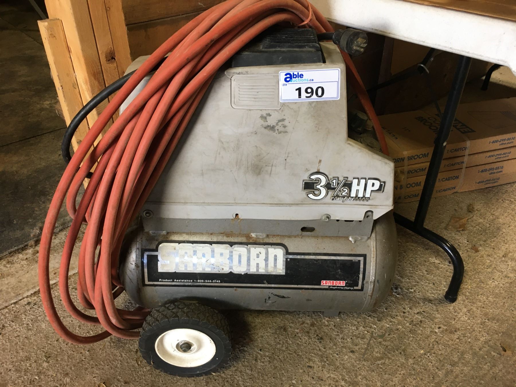 SANBORN 3 1/2HP. AIR COMPRESSOR WITH APPROX. 50FT HOSE LINE