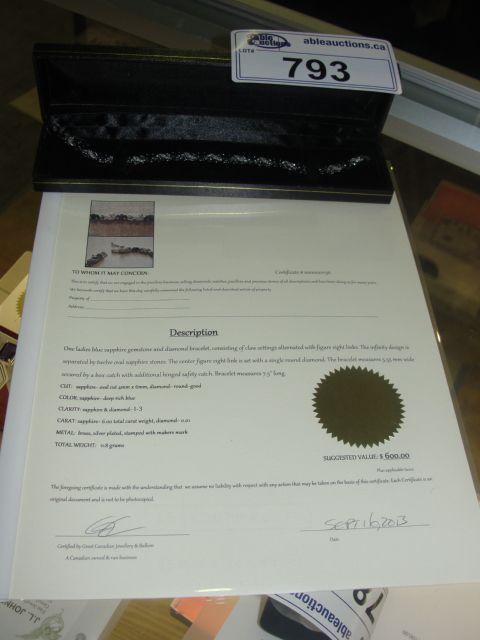 SAPPHIRE AND DAIMOND LADIES TENNIS BRACELET. INCLUDES $600 CERTIFICATE