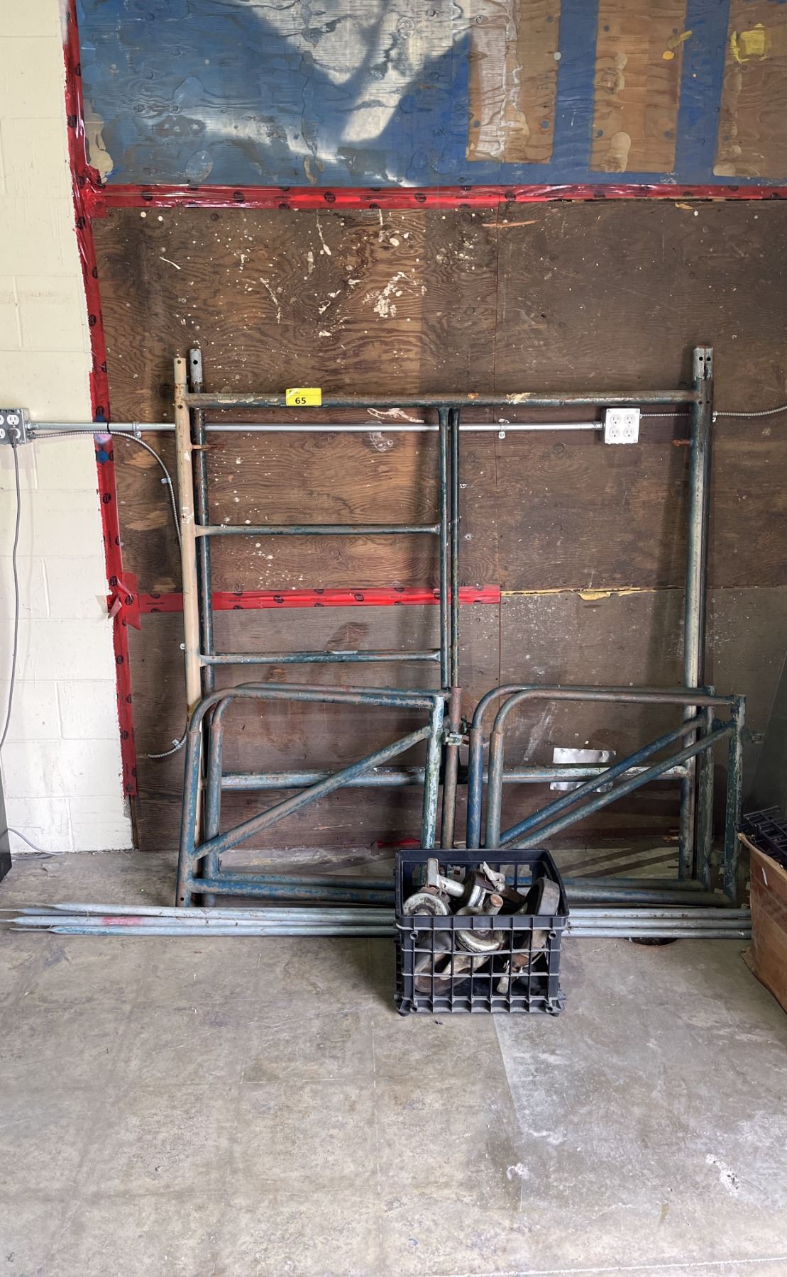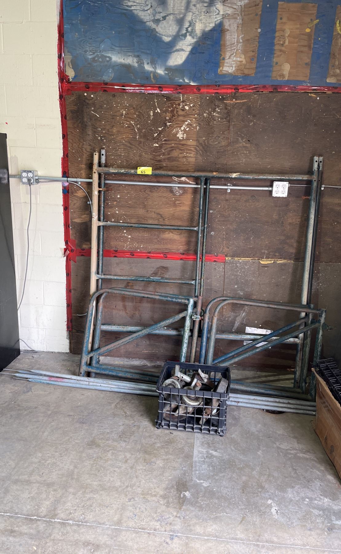 SCAFFOLDING WITH DOORS, WHEELS, CROSS BEAMS, AND SIDE WALLS