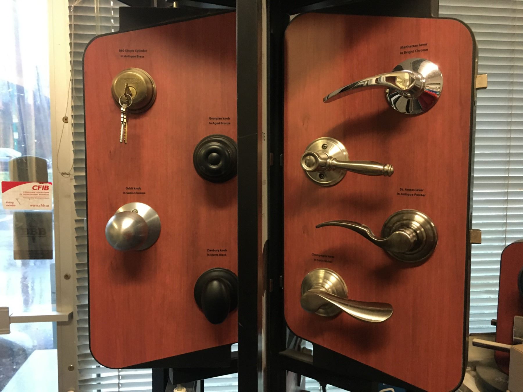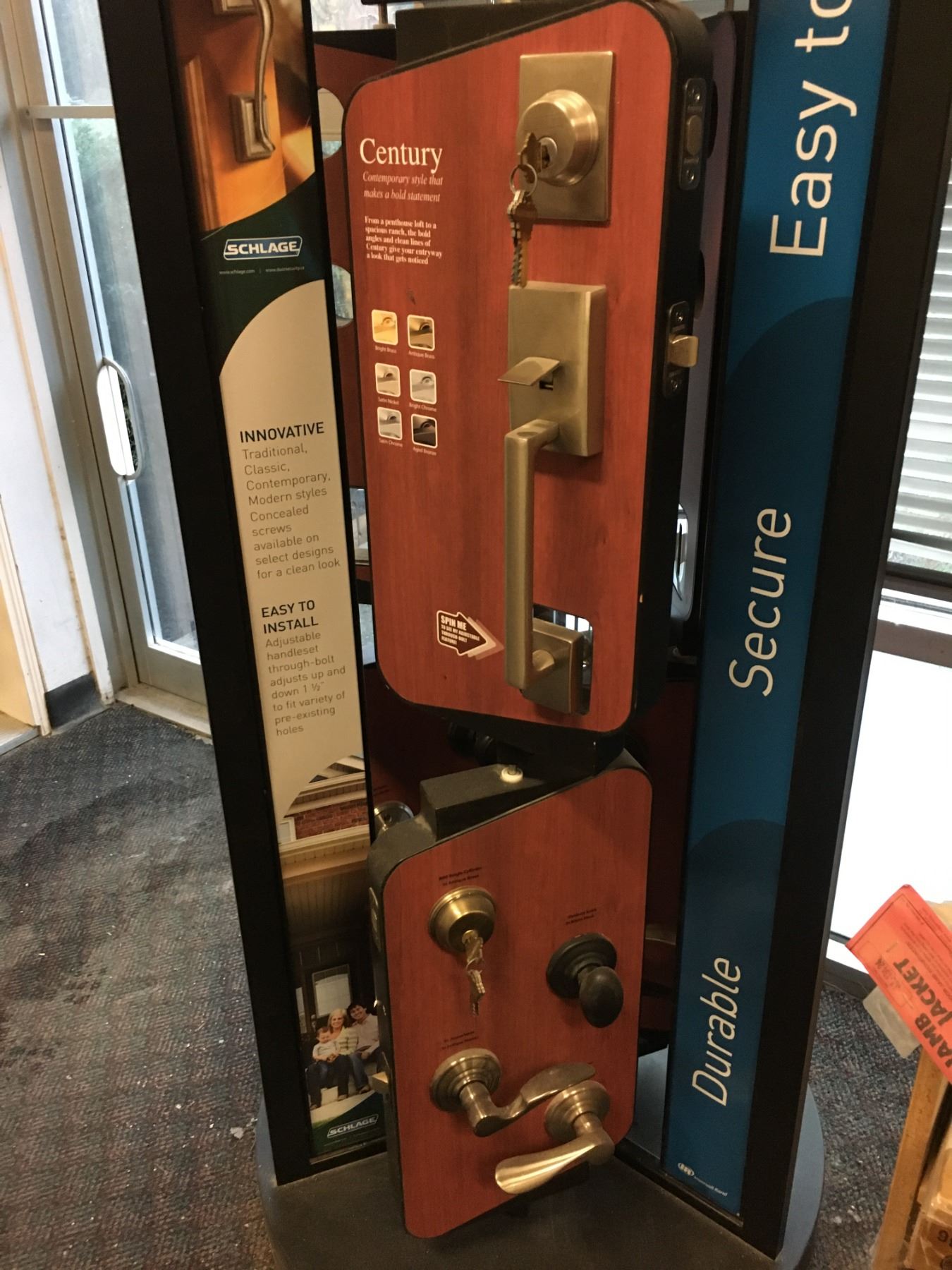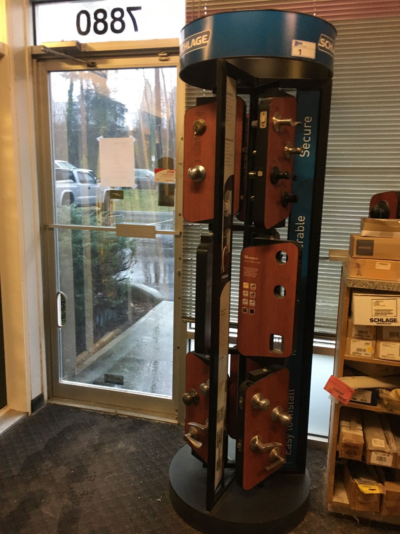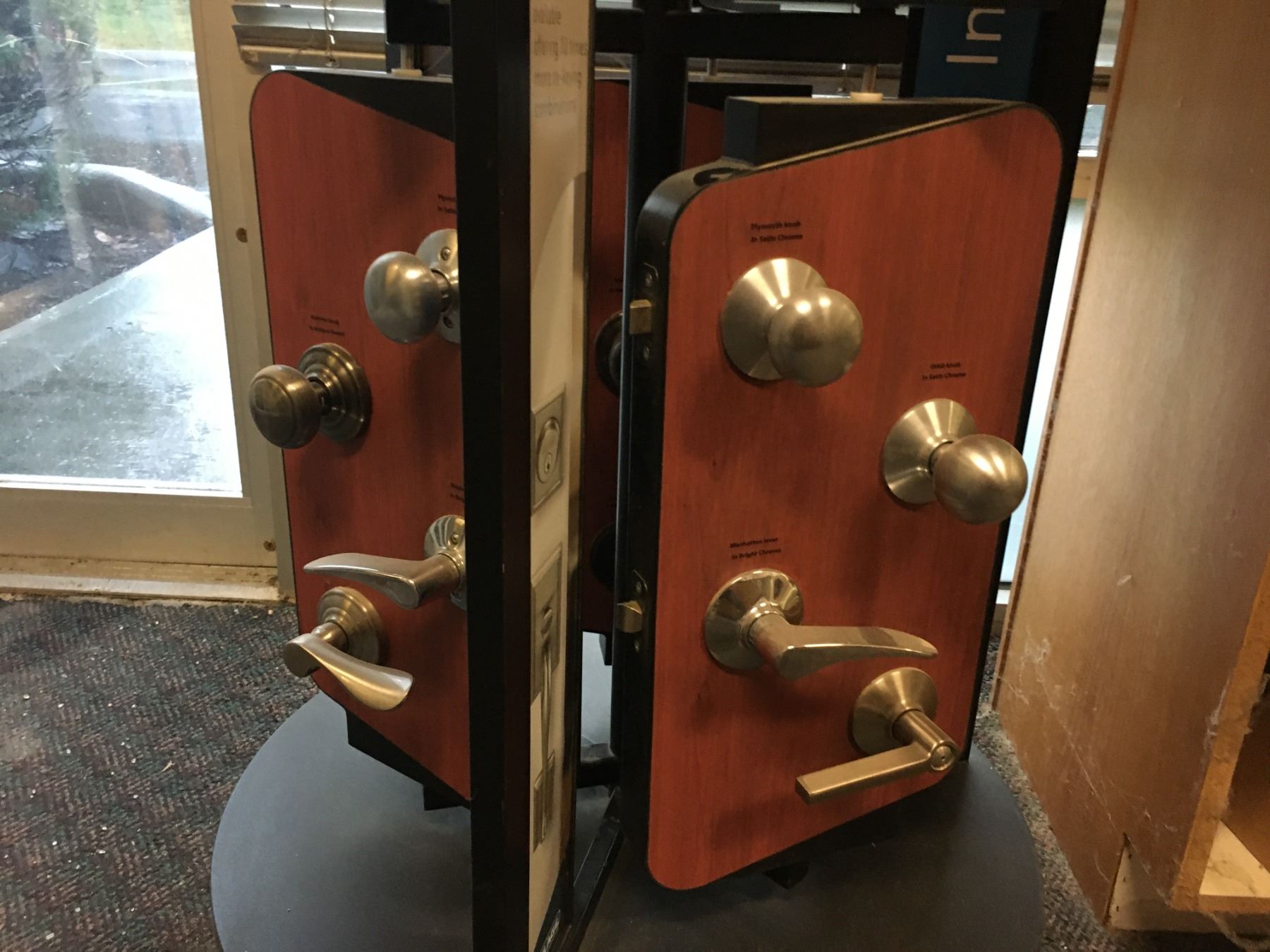 SCHLAGE DOOR HANDLE DISPLAY STAND WITH ASSORTED DOOR HANDLES