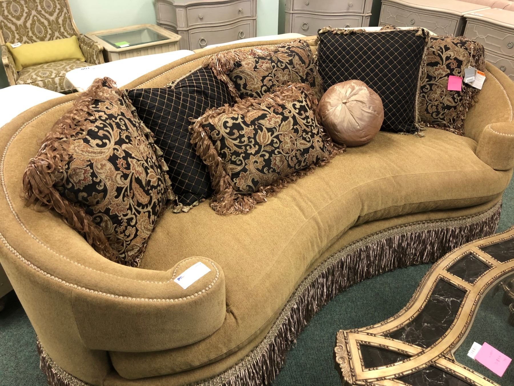 SCHNADIG COMPOSITIONS FORMAL ROUNDED BACK SOFA WITH THROW CUSHIONS. RETAIL $7,999.00