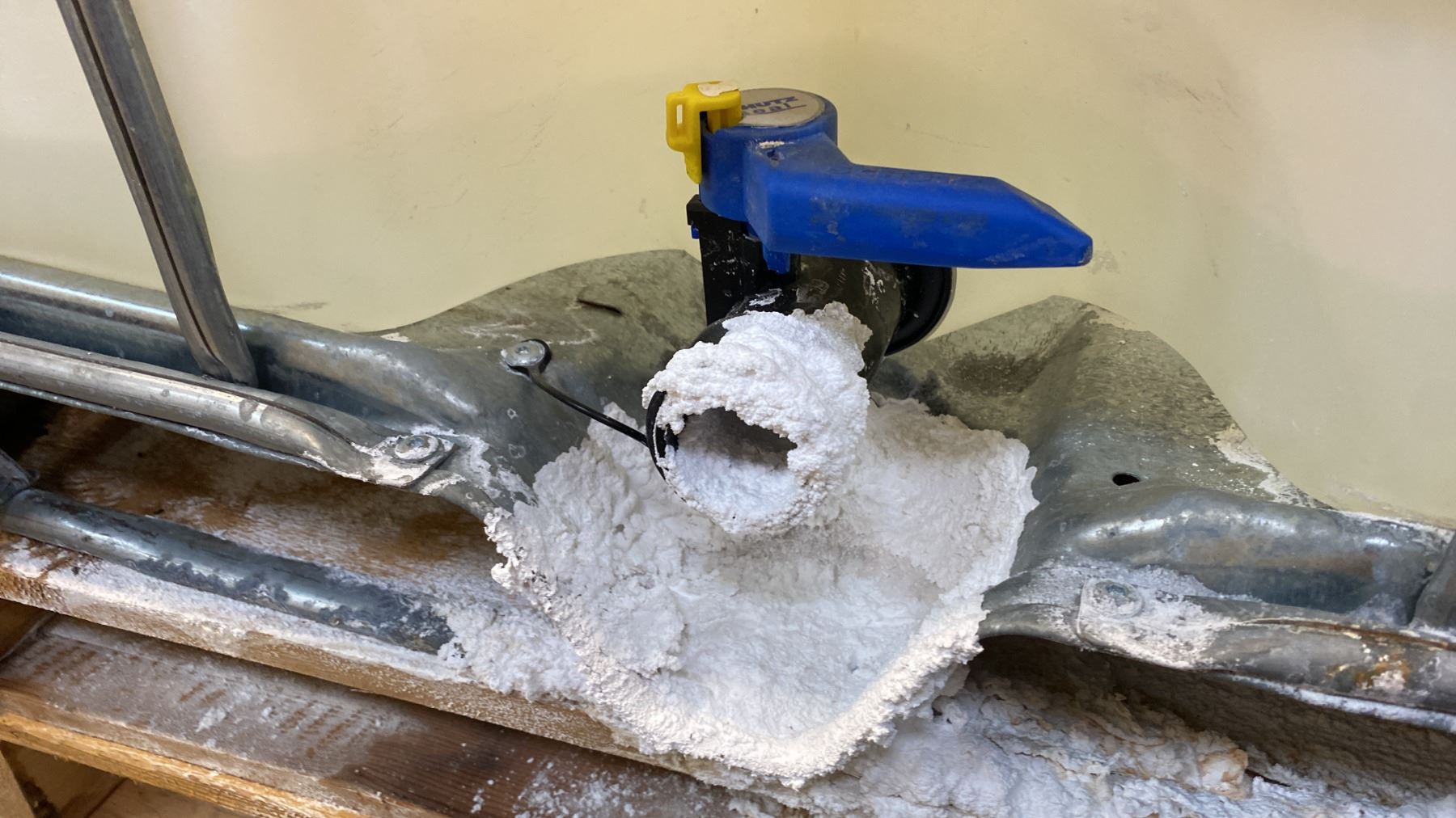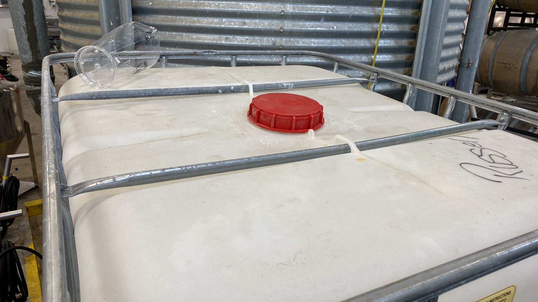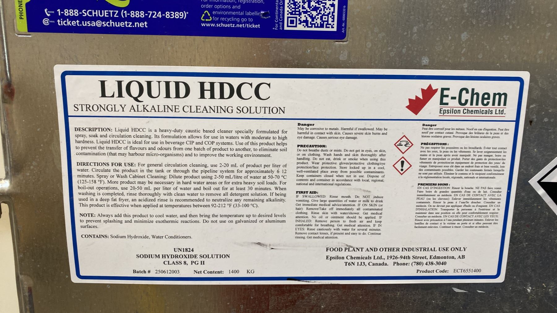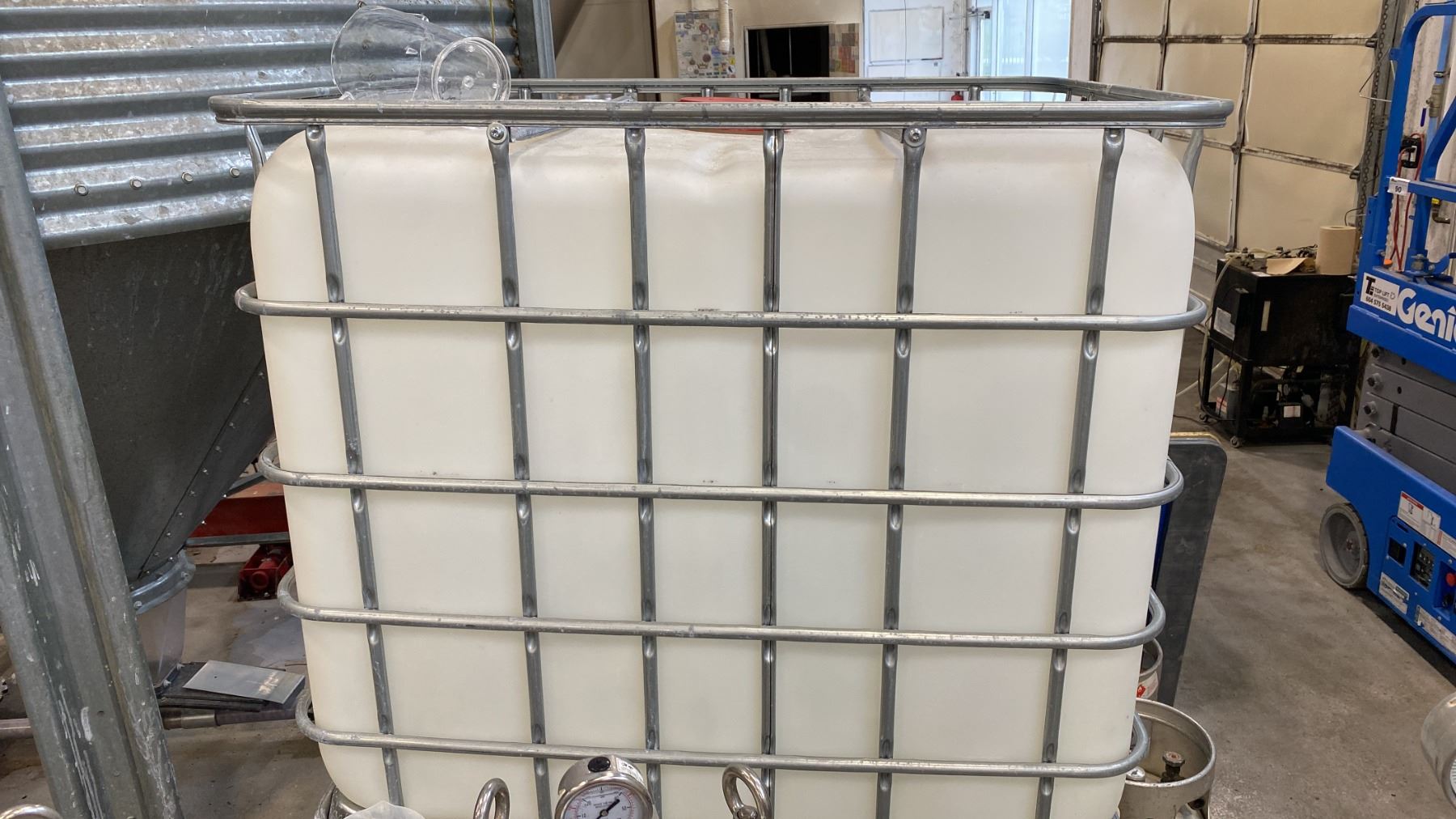SCHUETZ 1040 LITRE CAPACITY PLASTIC LIQUID STORAGE CONTAINER IN METAL PALLET CAGE *SMALL AMOUNT OF STRONGLY ALKALINE CLEANING SOLUTION LEFT IN CONTAINER*