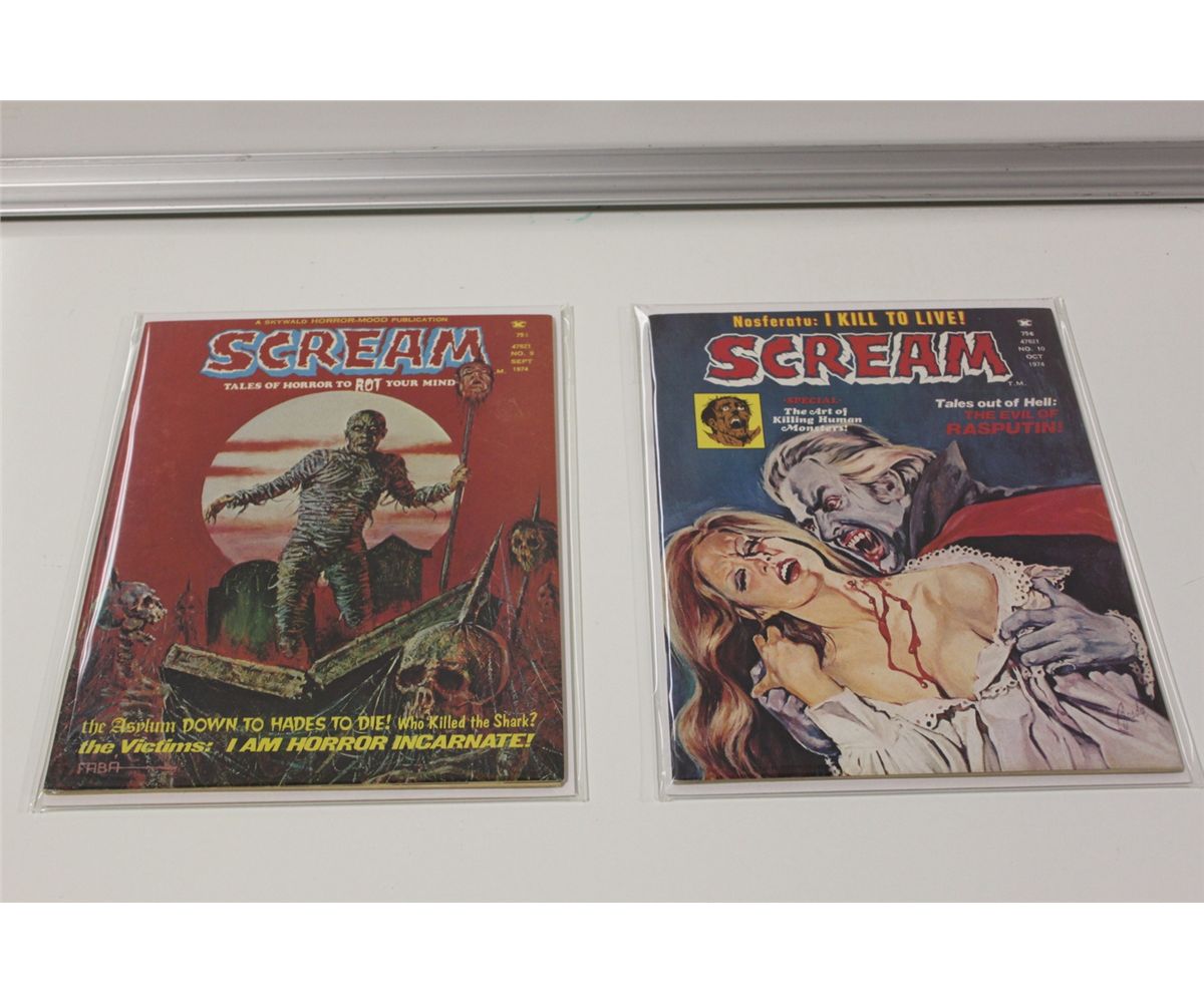 SCREAM #9 & 10 *MANITOBA PEDIGREE WITH CERTIFICATE* (1973) #9 (SEVERED HEAD COVER) 9.0 (VF/NM), #10 - 9.2 (NM-) GRADED BY DOUG SULIPA, GRUESOME & GORY CONTENT - '2 GEMS'