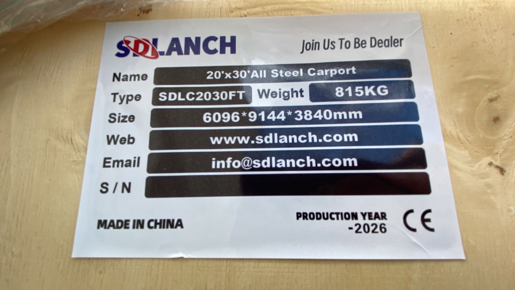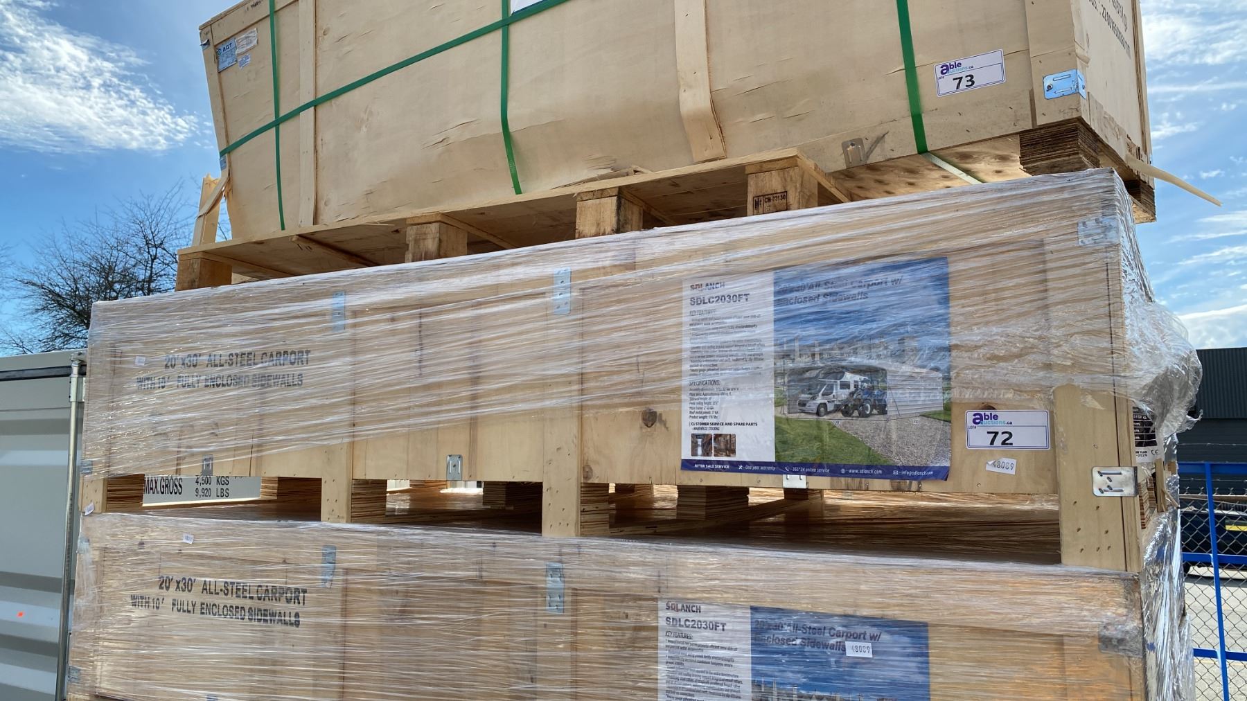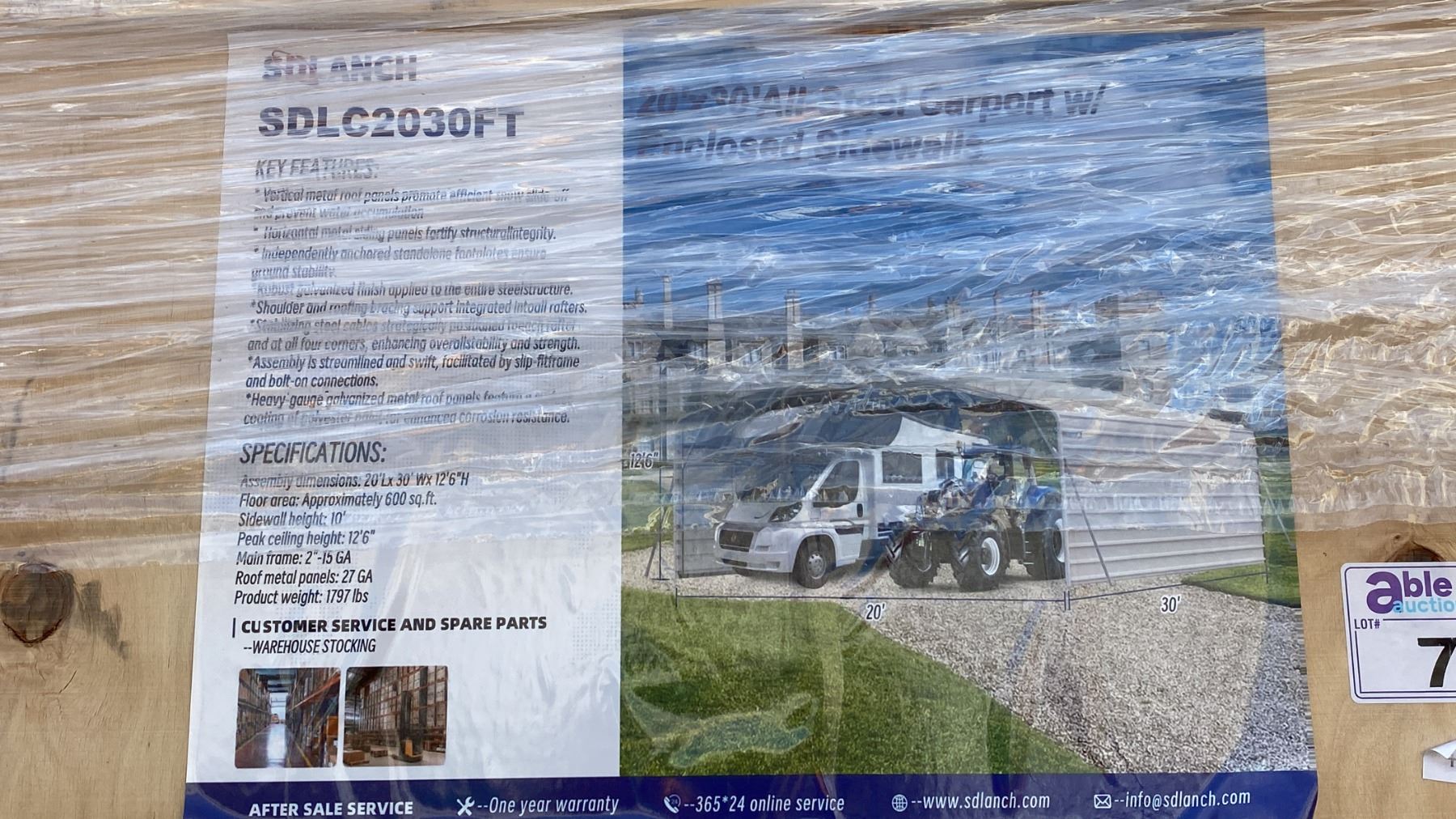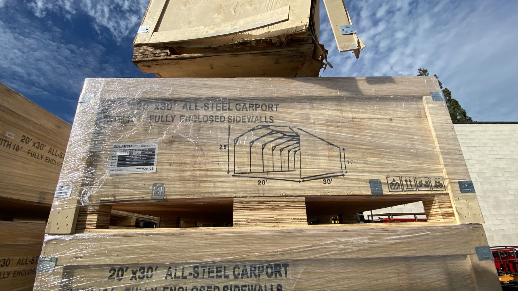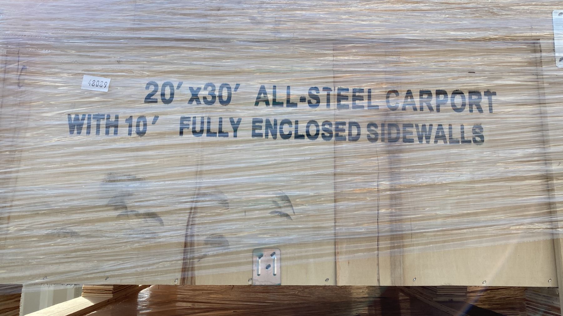 SDLANCH SDLC2030FT 20' X 30' ALL STEEL CARPORT WITH ENCLOSED SIDEWALLS IN WOODEN CRATE APPROX WEIGHT 1800 LBS CRATE MEASURES APPROX 88"L X 47"W X 20"H *LAST DAY REMOVAL*