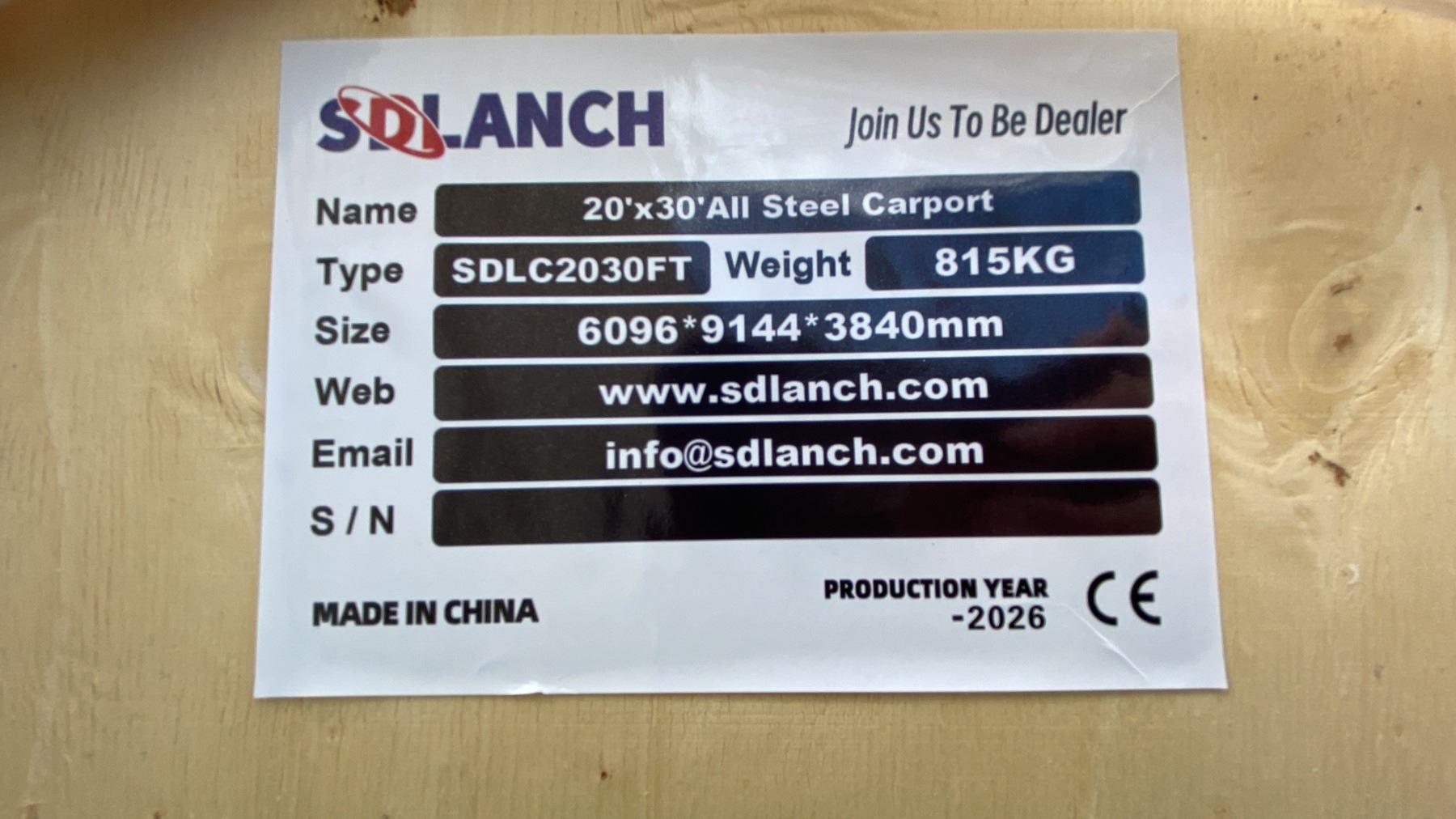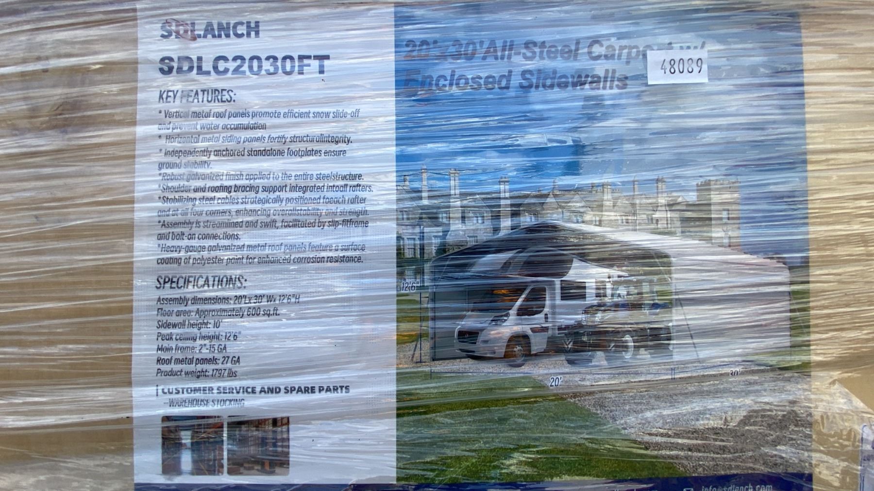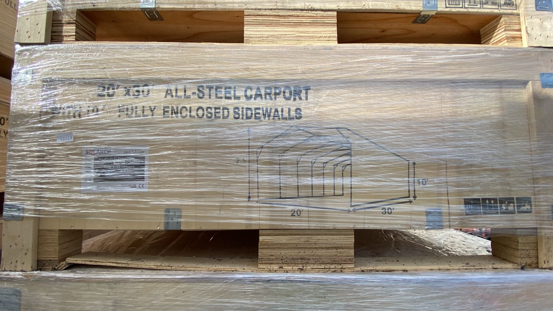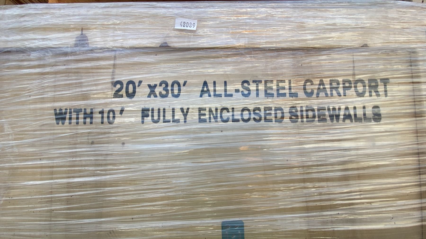 SDLANCH SDLC2030FT 20' X 30' ALL STEEL CARPORT WITH ENCLOSED SIDEWALLS IN WOODEN CRATE APPROX WEIGHT 1800 LBS CRATE MEASURES APPROX 88"L X 47"W X 20"H *LAST DAY REMOVAL*