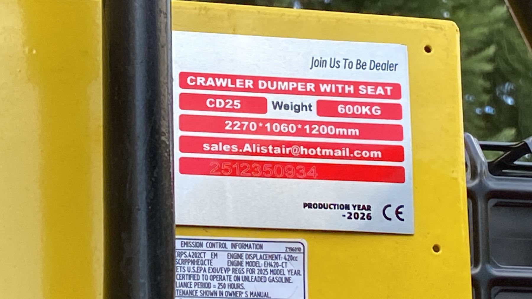 SDLANCH SDLD25 YELLOW RIDE ON GAS POWERED MINI CRAWLER DUMPER, 3 SPEED WITH 9" TRACKS & TOOLBOX *MEETS CANADIAN EMISSIONS CONTROL REGULATIONS* *MUST HAVE PROPER EQUIPMENT TO TRANSPORT*