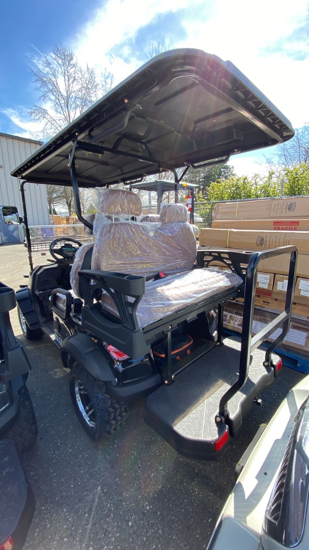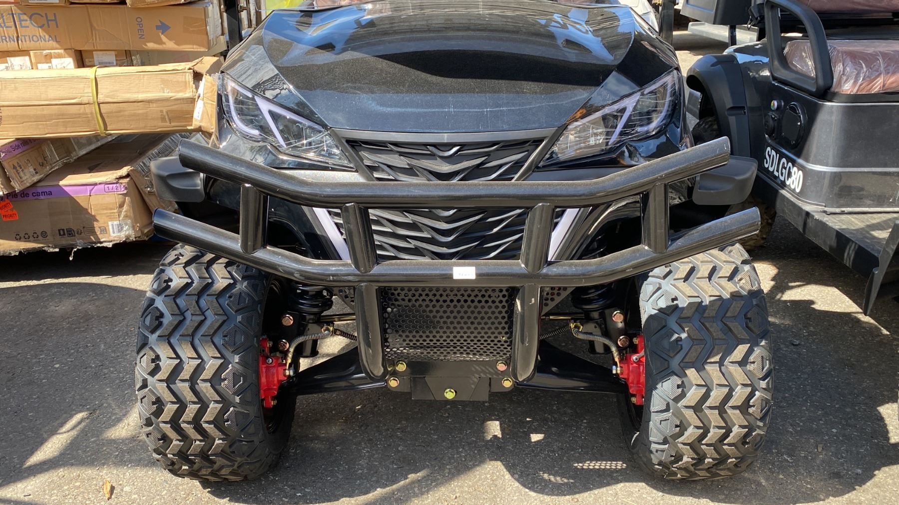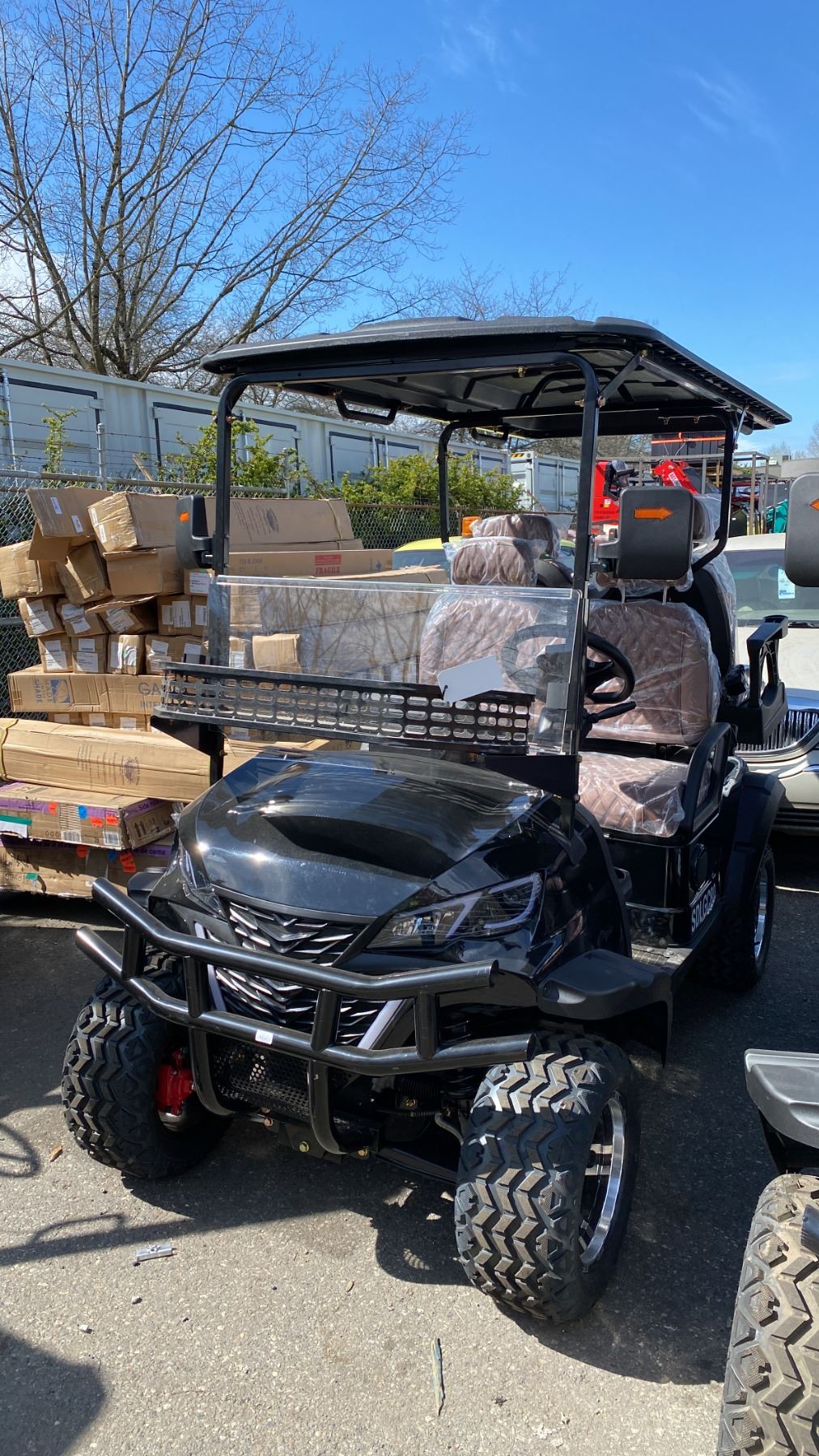 SDLANCH SDLGC80 BLACK 4 SEAT ELECTRIC GOLF CART WITH 4KW AC MOTOR, 50 MILE RANGE, 23-24 MPH TOP SPEED, LED LIGHTS, LCD SCREEN, USB PORT, BLUETOOTH MEDIA SYSTEM, REAR BACKUP CAMERA, FULL LIGHTS, PNEUMATIC TIRES, & CONVERTER 110V CHARGING HAS KEY, CHARGER, TOOL KIT, FRONT WINDSHIELD & RAIN COVER* *DISASSEMBLED, READY FOR TRANSPORTATION* **MAY REQUIRE PARTS/REPAIR**