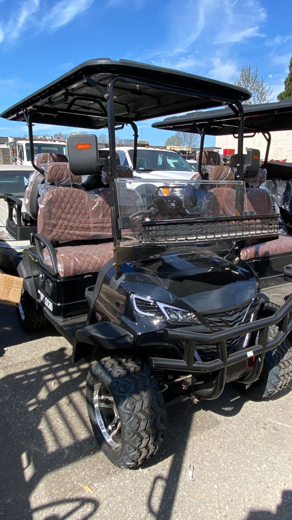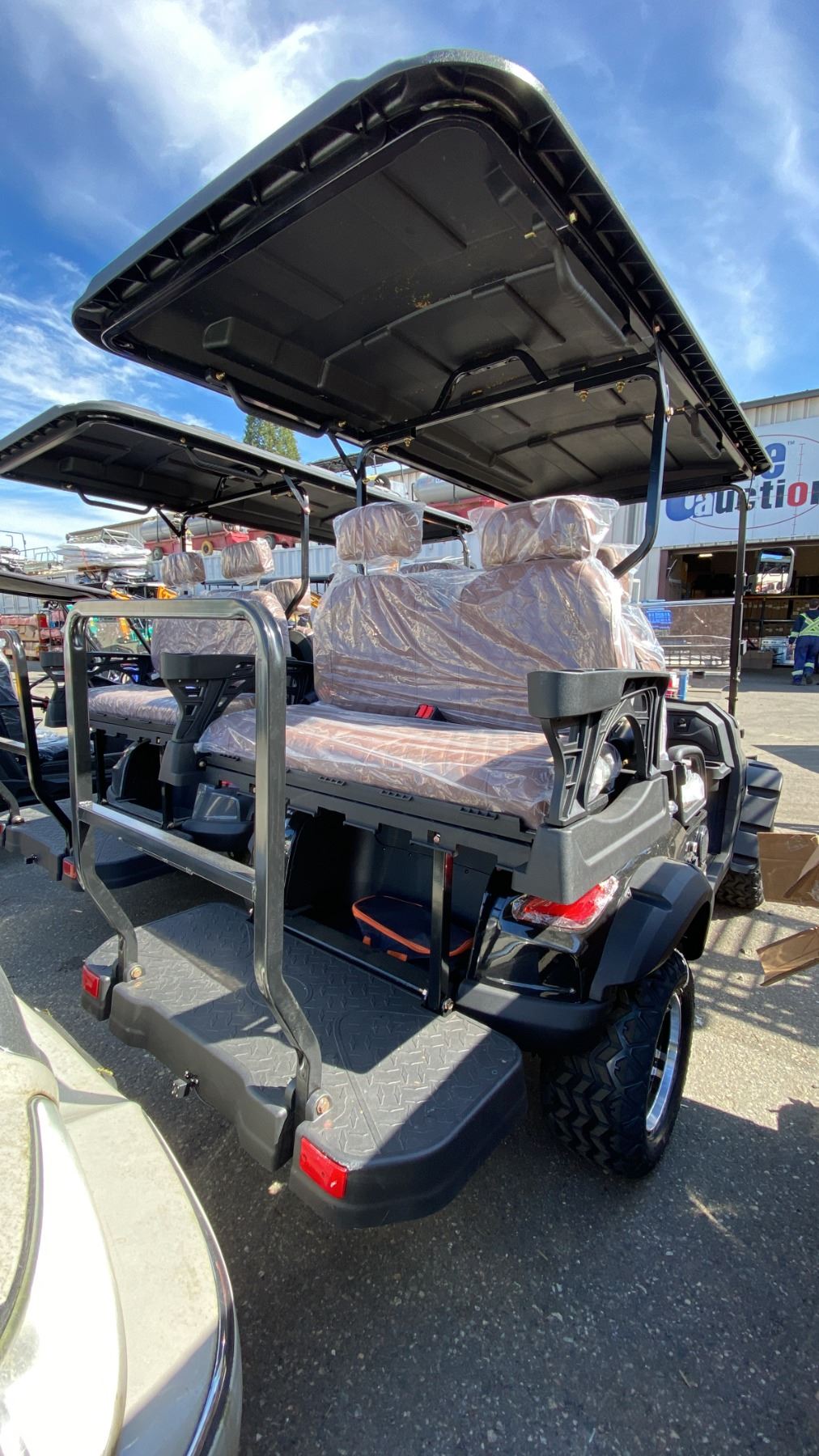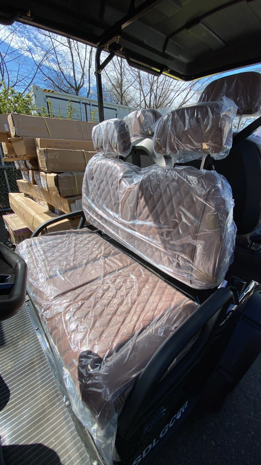 SDLANCH SDLGC80 BLACK 4 SEAT ELECTRIC GOLF CART WITH 4KW AC MOTOR, 50 MILE RANGE, 23-24 MPH TOP SPEED, LED LIGHTS, LCD SCREEN, USB PORT, BLUETOOTH MEDIA SYSTEM, REAR BACKUP CAMERA, FULL LIGHTS, PNEUMATIC TIRES, & CONVERTER 110V CHARGING HAS KEY, CHARGER, TOOL KIT, FRONT WINDSHIELD & RAIN COVER* *DISASSEMBLED, READY FOR TRANSPORTATION* **MAY REQUIRE PARTS/REPAIR**