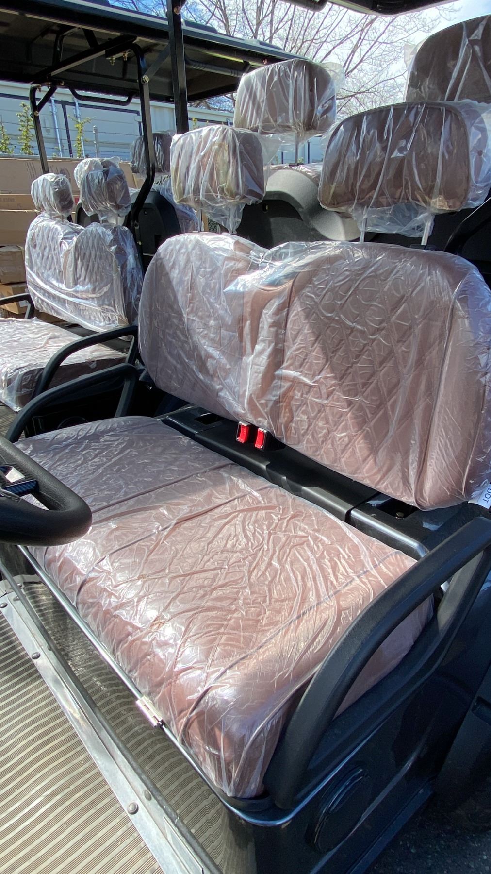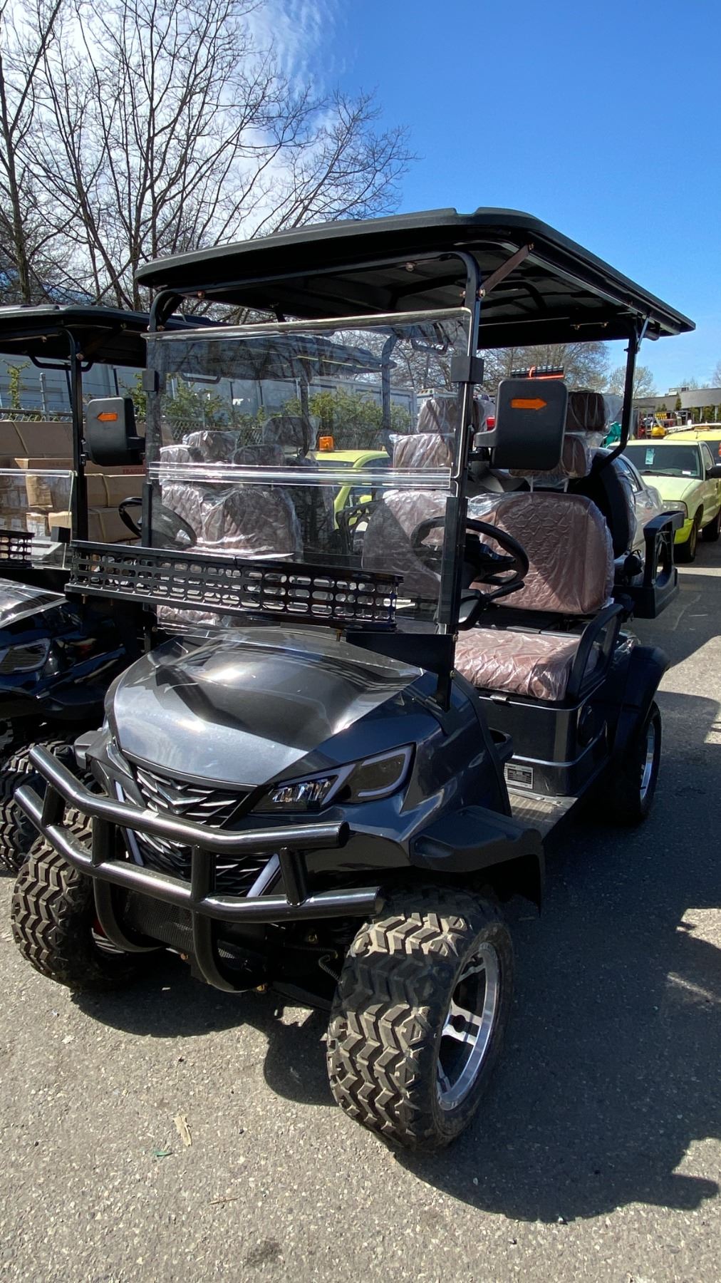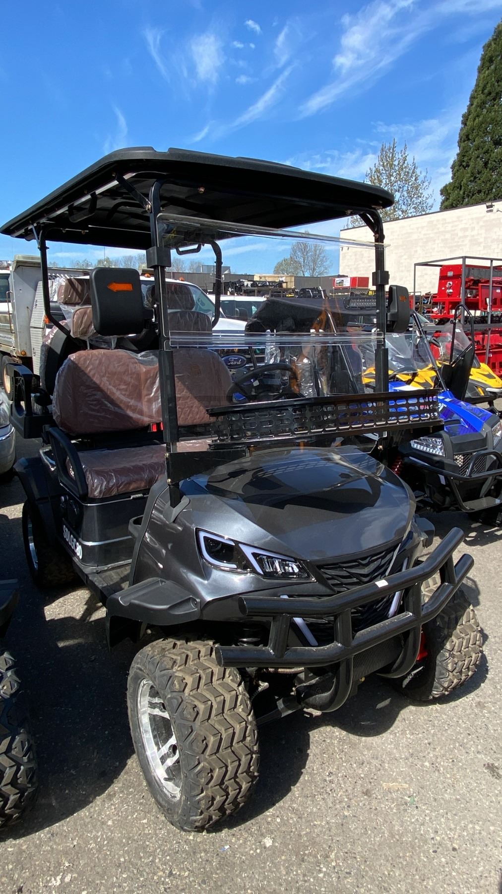 SDLANCH SDLGC80 GREY 4 SEAT ELECTRIC GOLF CART WITH 4KW AC MOTOR, 50 MILE RANGE, 23-24 MPH TOP SPEED, LED LIGHTS, LCD SCREEN, USB PORT, BLUETOOTH MEDIA SYSTEM, REAR BACKUP CAMERA, FULL LIGHTS, PNEUMATIC TIRES, & CONVERTER 110V CHARGING HAS KEY, CHARGER, TOOL KIT, FRONT WINDSHIELD & RAIN COVER* *DISASSEMBLED, READY FOR TRANSPORTATION* **MAY REQUIRE PARTS/REPAIR**
