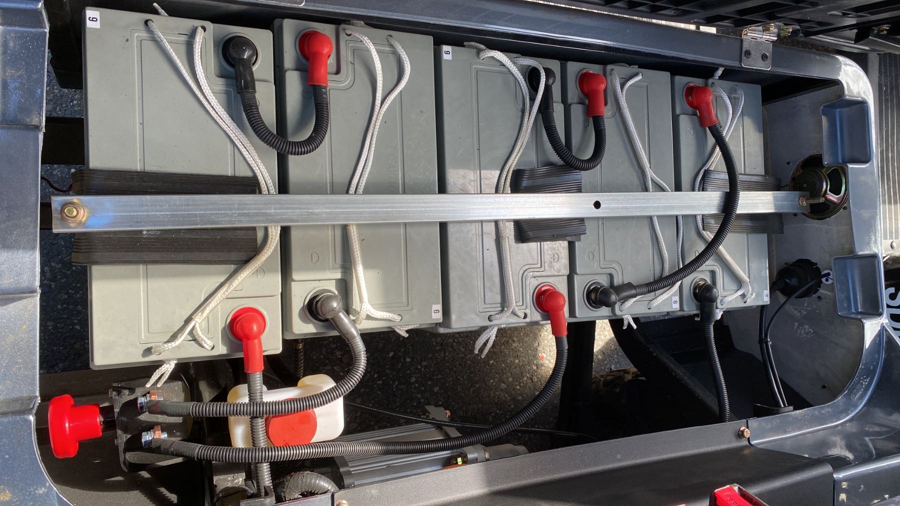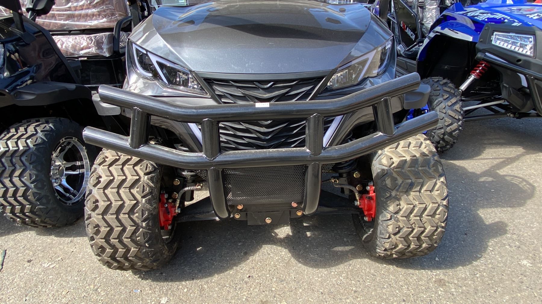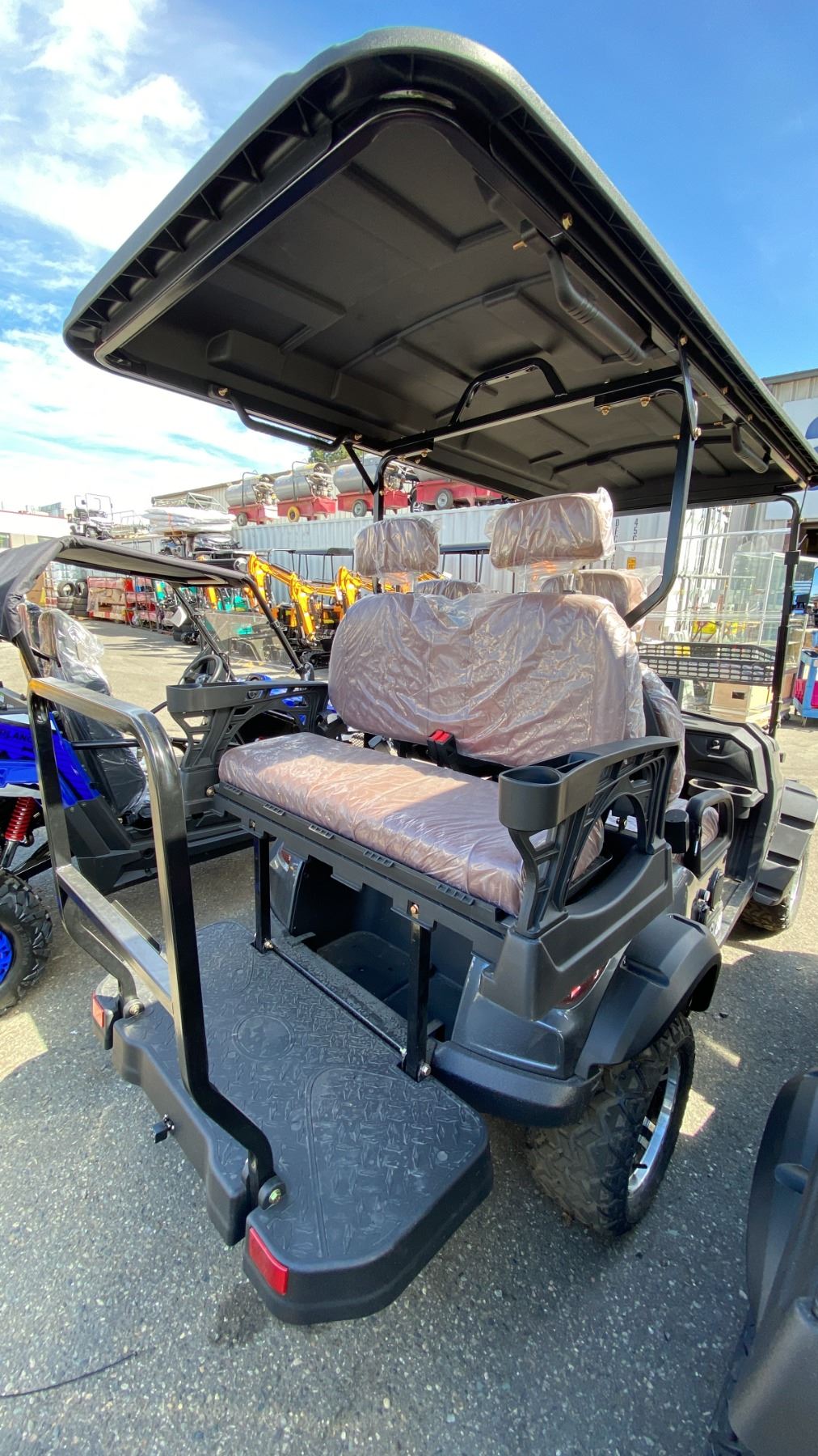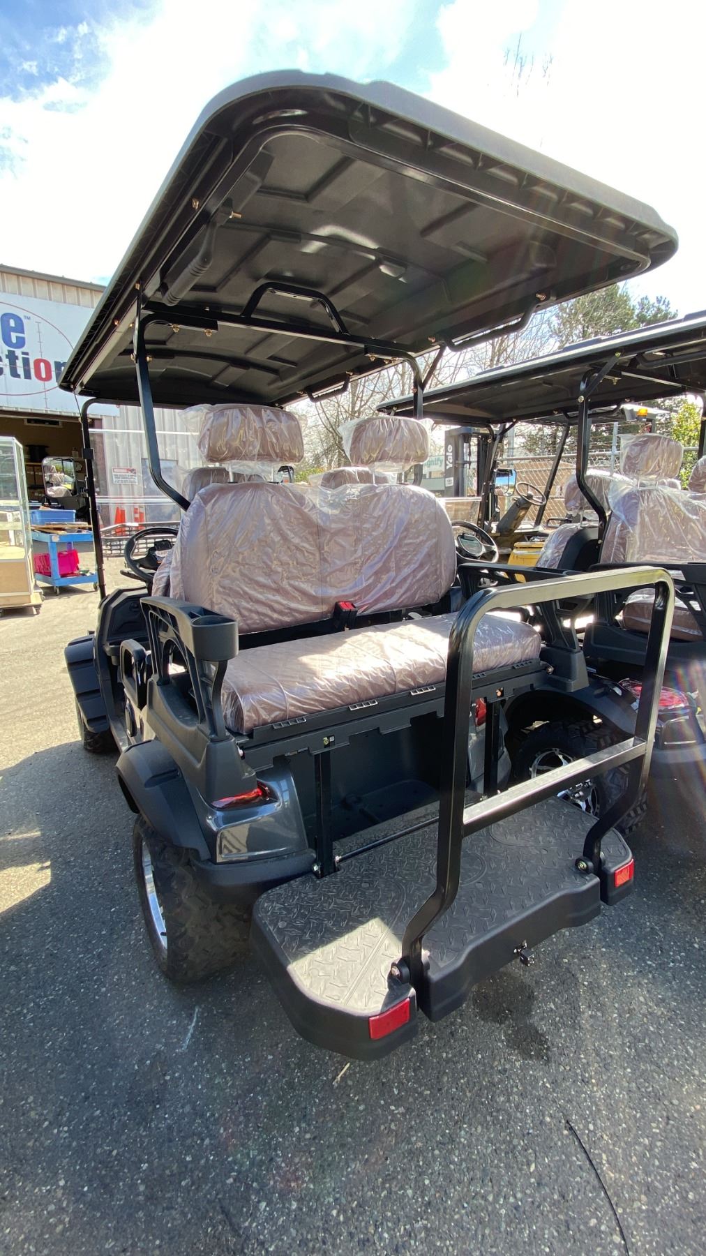 SDLANCH SDLGC80 GREY 4 SEAT ELECTRIC GOLF CART WITH 4KW AC MOTOR, 50 MILE RANGE, 23-24 MPH TOP SPEED, LED LIGHTS, LCD SCREEN, USB PORT, BLUETOOTH MEDIA SYSTEM, REAR BACKUP CAMERA, FULL LIGHTS, PNEUMATIC TIRES, & CONVERTER 110V CHARGING HAS KEY, CHARGER, TOOL KIT, FRONT WINDSHIELD & RAIN COVER* *DISASSEMBLED, READY FOR TRANSPORTATION* **MAY REQUIRE PARTS/REPAIR**