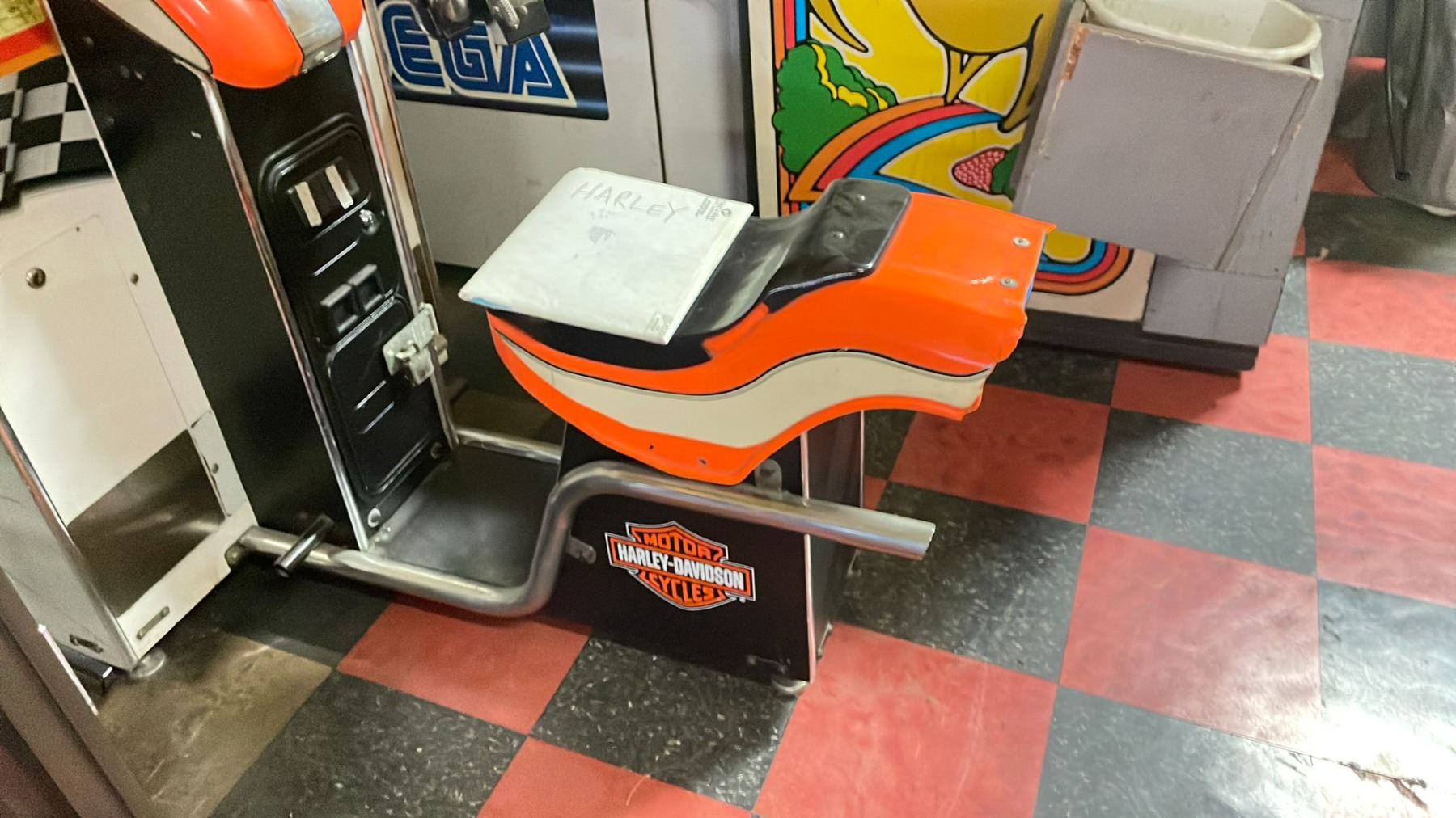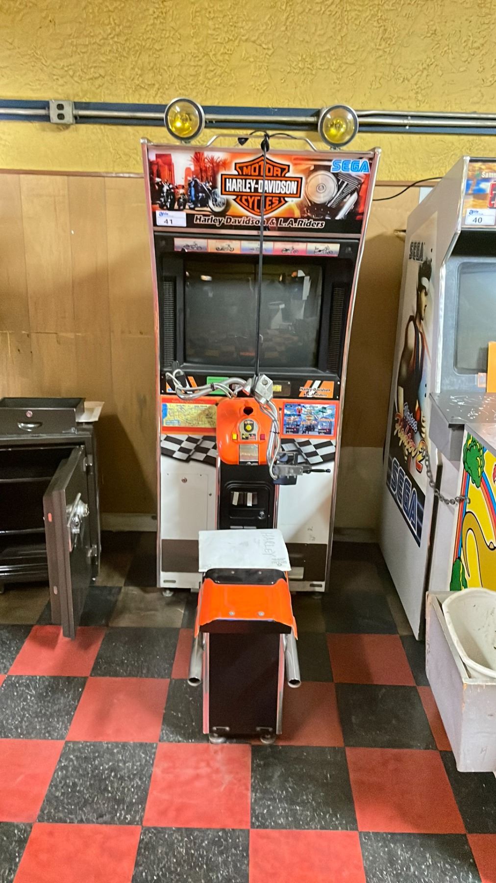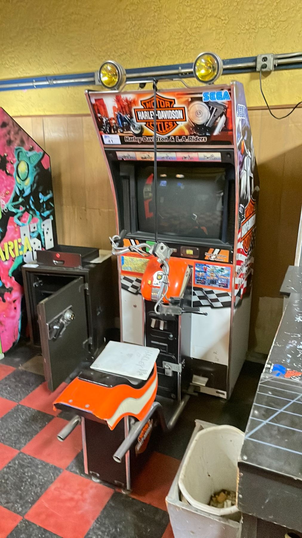 SEGA HARLEY-DAVIDSON MOTORCYCLES SINGLE PLAYER COIN OPERATED SEATED DRIVER ARCADE GAME IN STOCK CABINET WITH MANUALS *OUT OF ORDER, NEEDS REPAIRS*