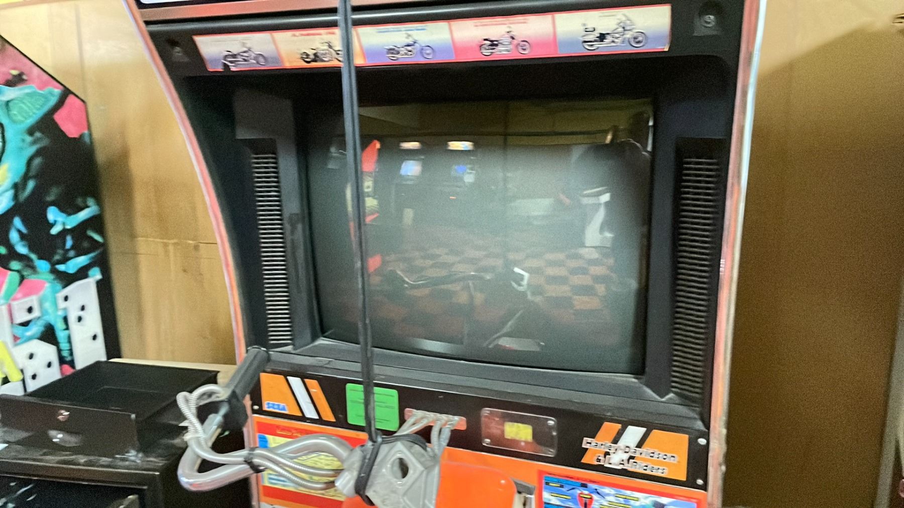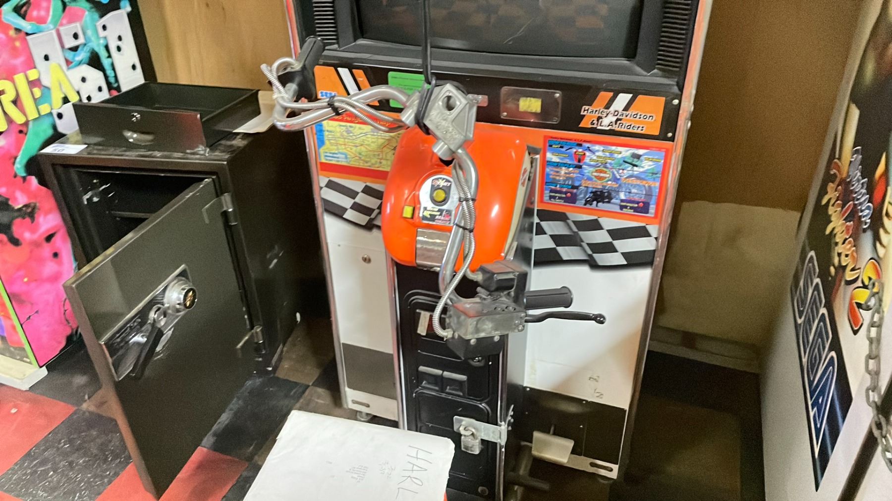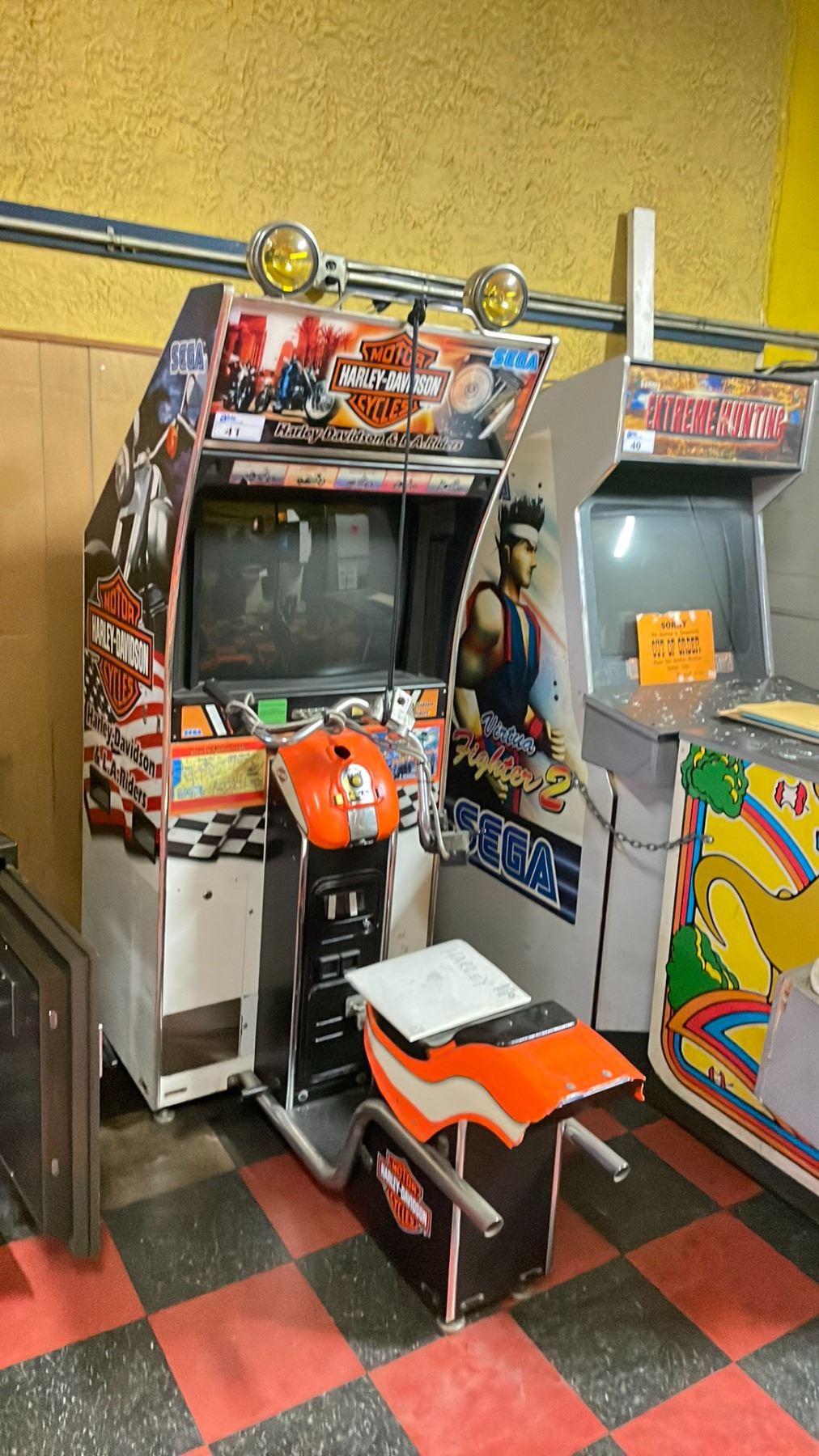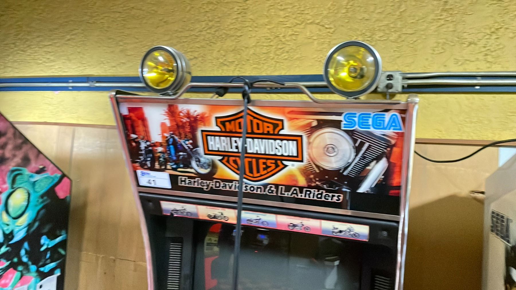 SEGA HARLEY-DAVIDSON MOTORCYCLES SINGLE PLAYER COIN OPERATED SEATED DRIVER ARCADE GAME IN STOCK CABINET WITH MANUALS *OUT OF ORDER, NEEDS REPAIRS*