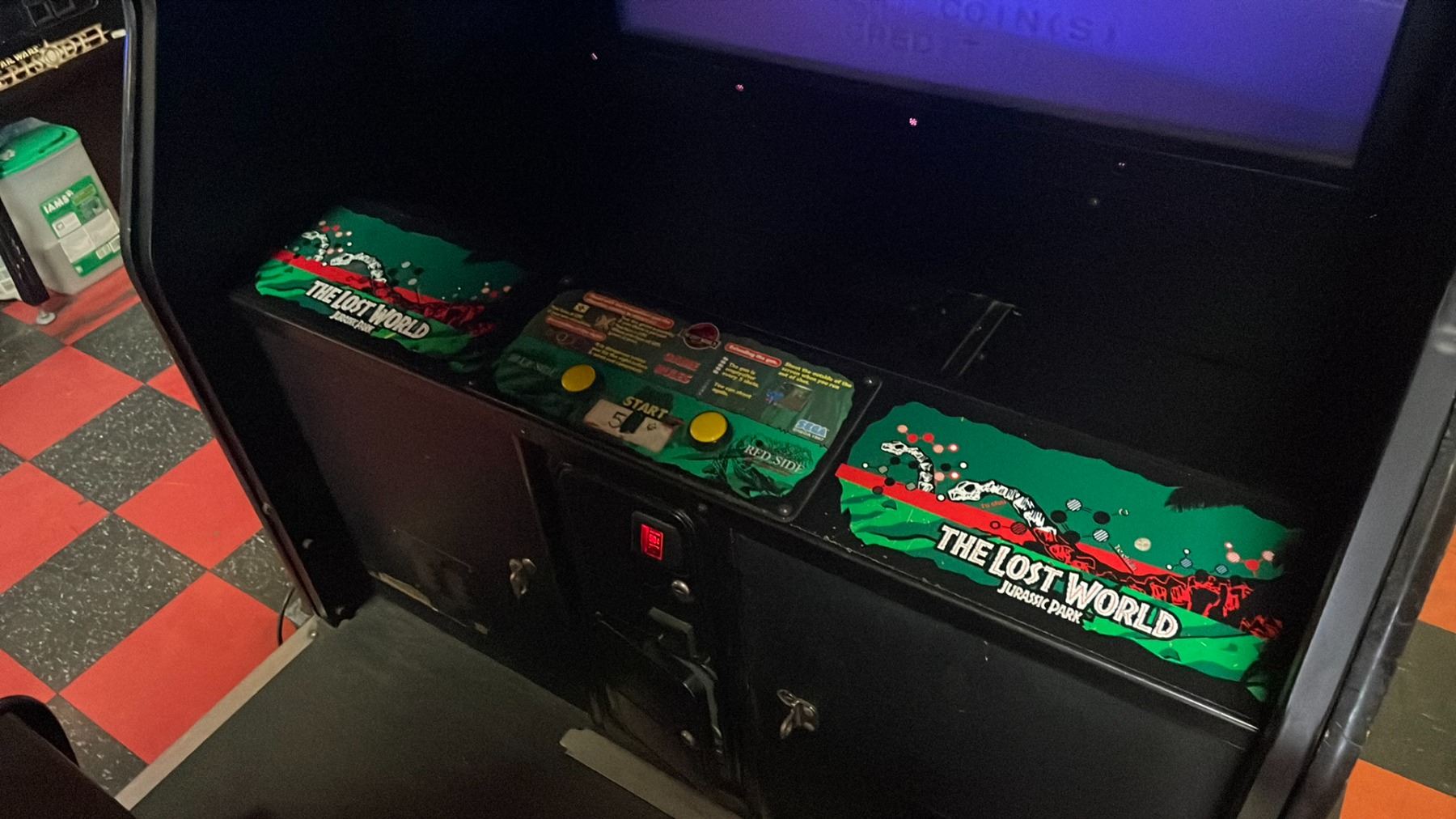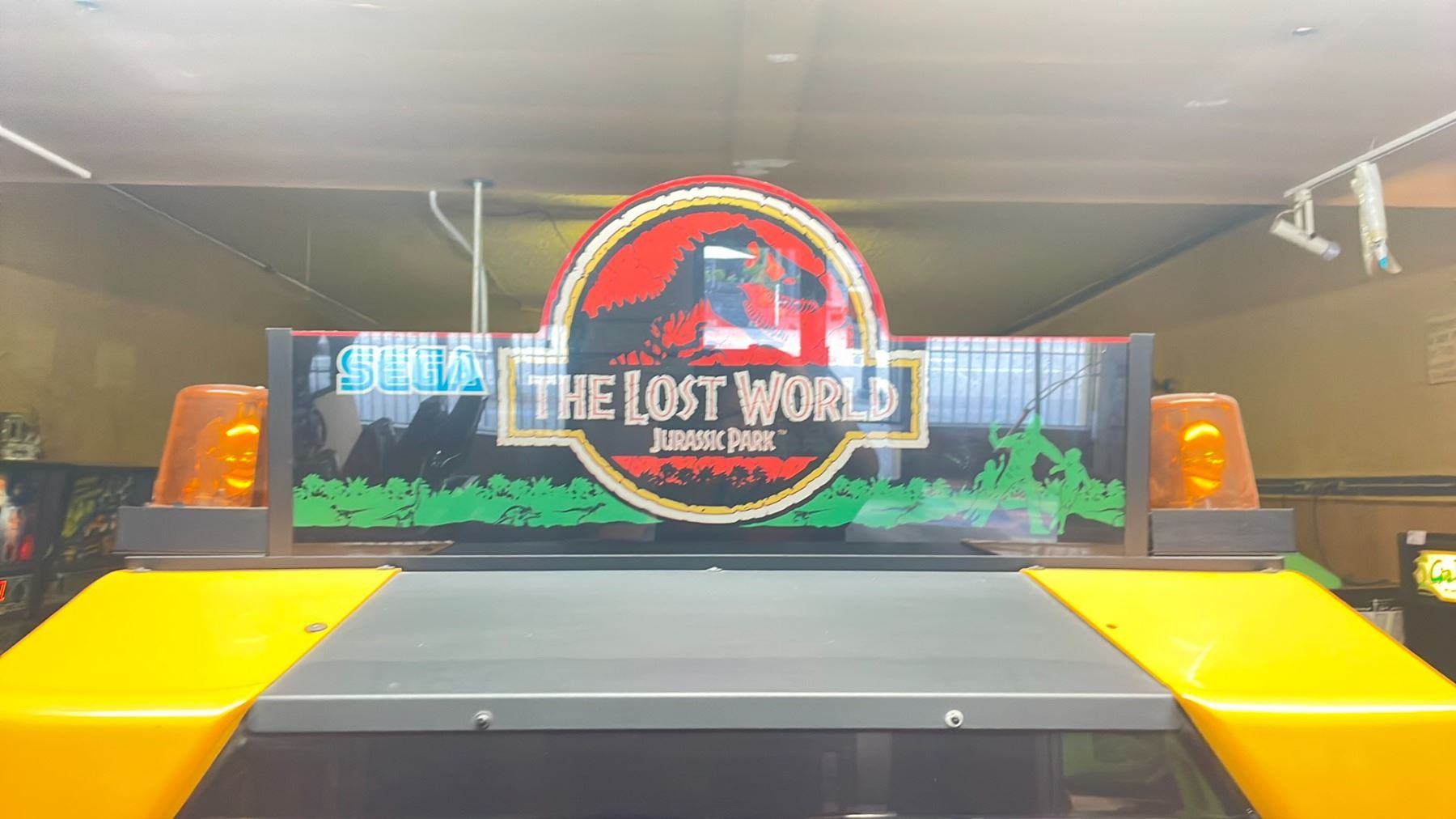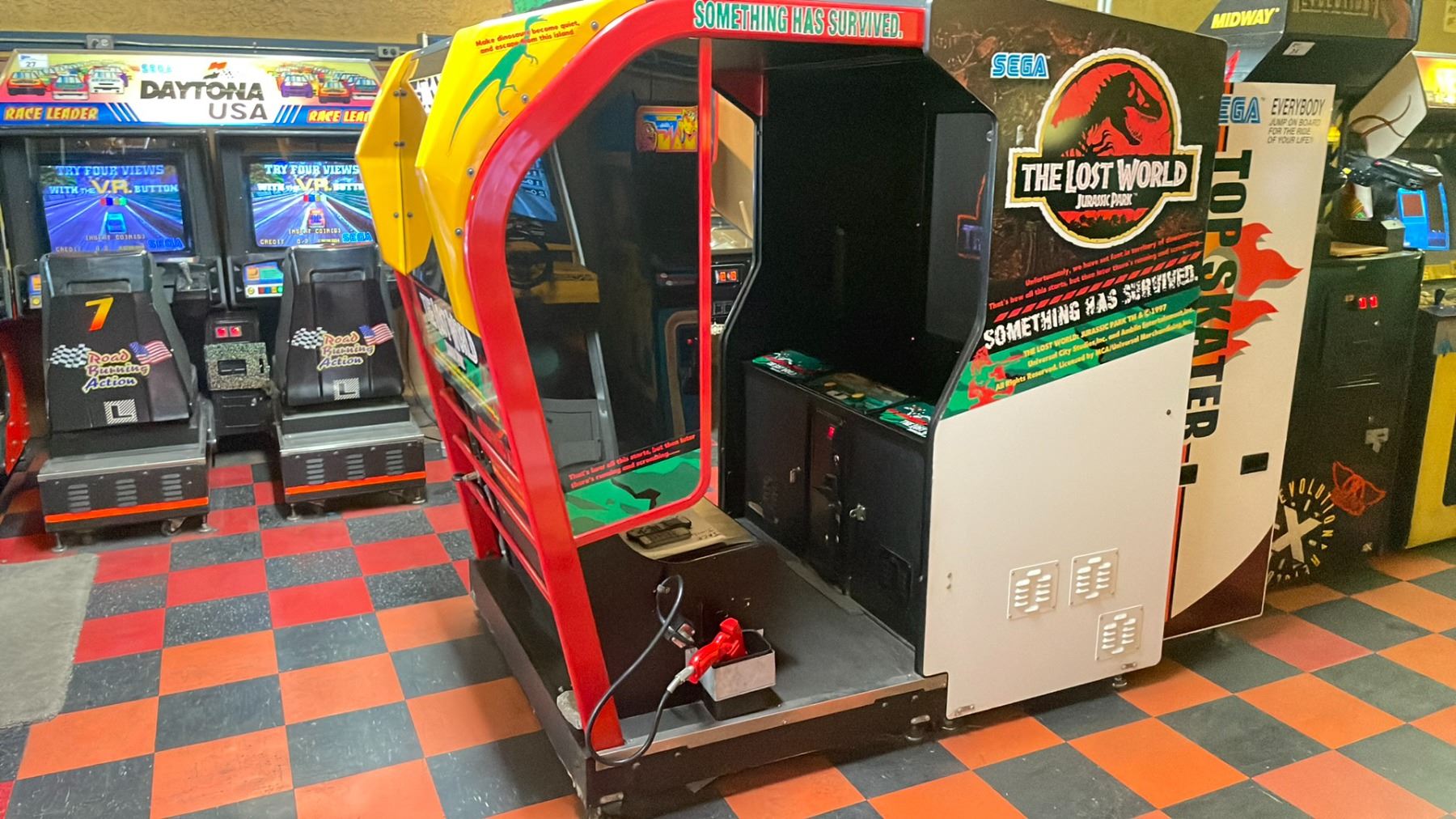 SEGA THE LOST WORLD JURASSIC PARK 2 PERSON COIN OPERATED SEATED SHOOTER ARCADE GAME IN STOCK CABINET WITH MANUALS