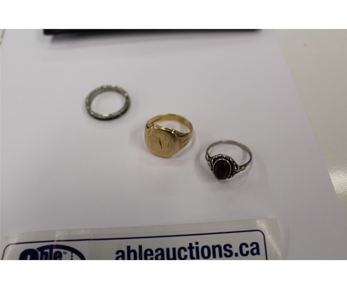 SELECTION OF COSTUME JEWELLERY RINGS, NECKLACE WITH "J" PENDANT AND A WALLET WITH FOREIGN COINS ALSO INCLUDES ONE 10KT GOLD RING