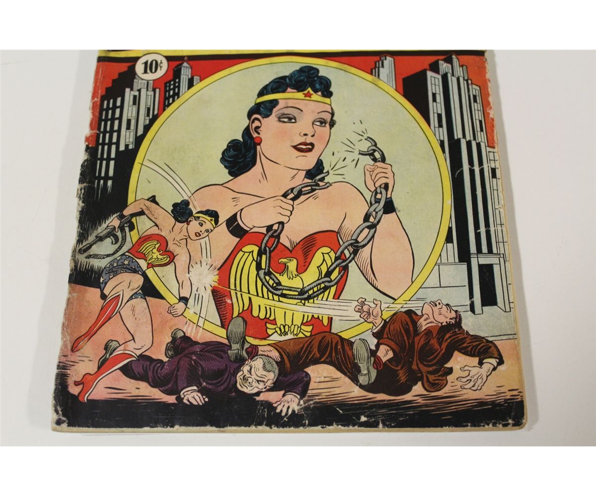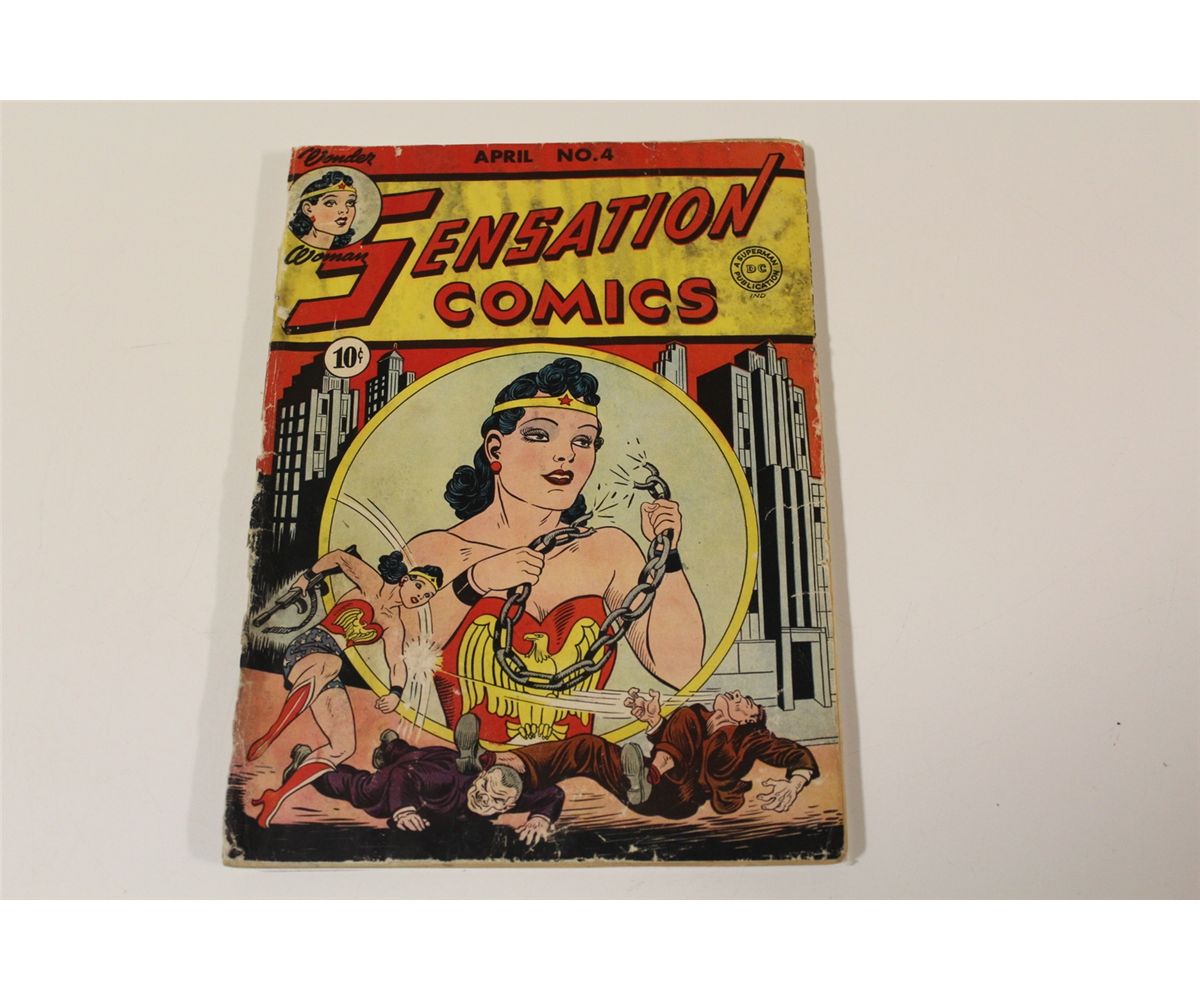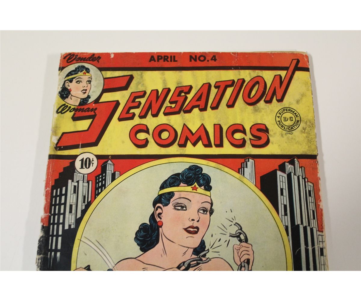 SENSATION COMICS #4 (1942) VERY EARLY GOLDEN AGE WONDER WOMAN. LOW GRADE COVER COMPLETELY SPLIT AT SPINE, MODERATE TO HEAVY BOOK LENGTH MOISTURE COMPLETE & SUPPLE, NO PIECES OUT.