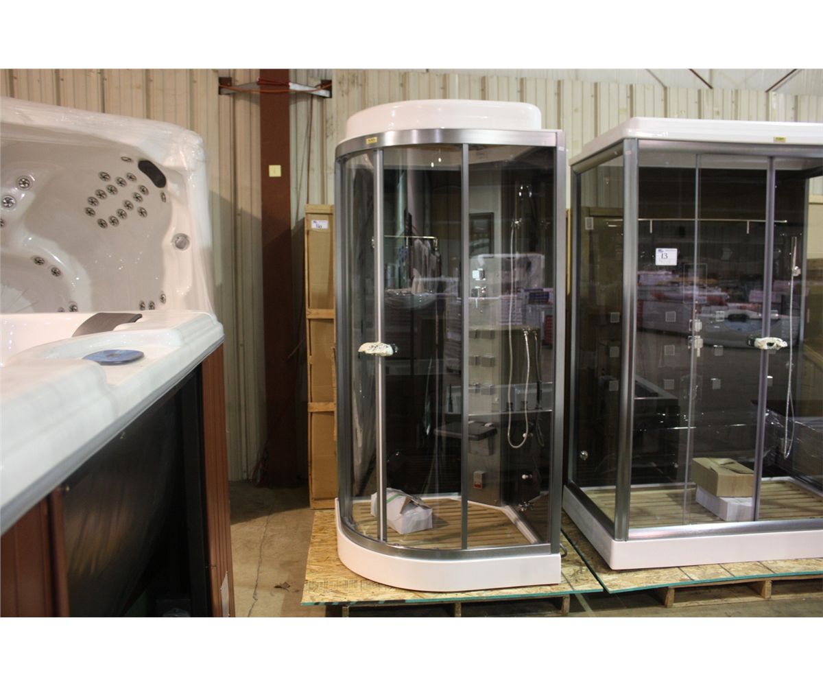 SERENITY CORNER STEAM SHOWER INC.: 6 BODY SPRAYS, OZONE SELF CLEANING SYSTEM, RAINWATER SHOWER HEAD, AROMATHERAPY, FOLDING SEAT, MARINE GRADE S.S. FIXTURES, TOUCH SCREEN CONTROL PANEL, MARINE SPEAKER, EXHAUST FAN AND MORE...(FLOOR MODEL)