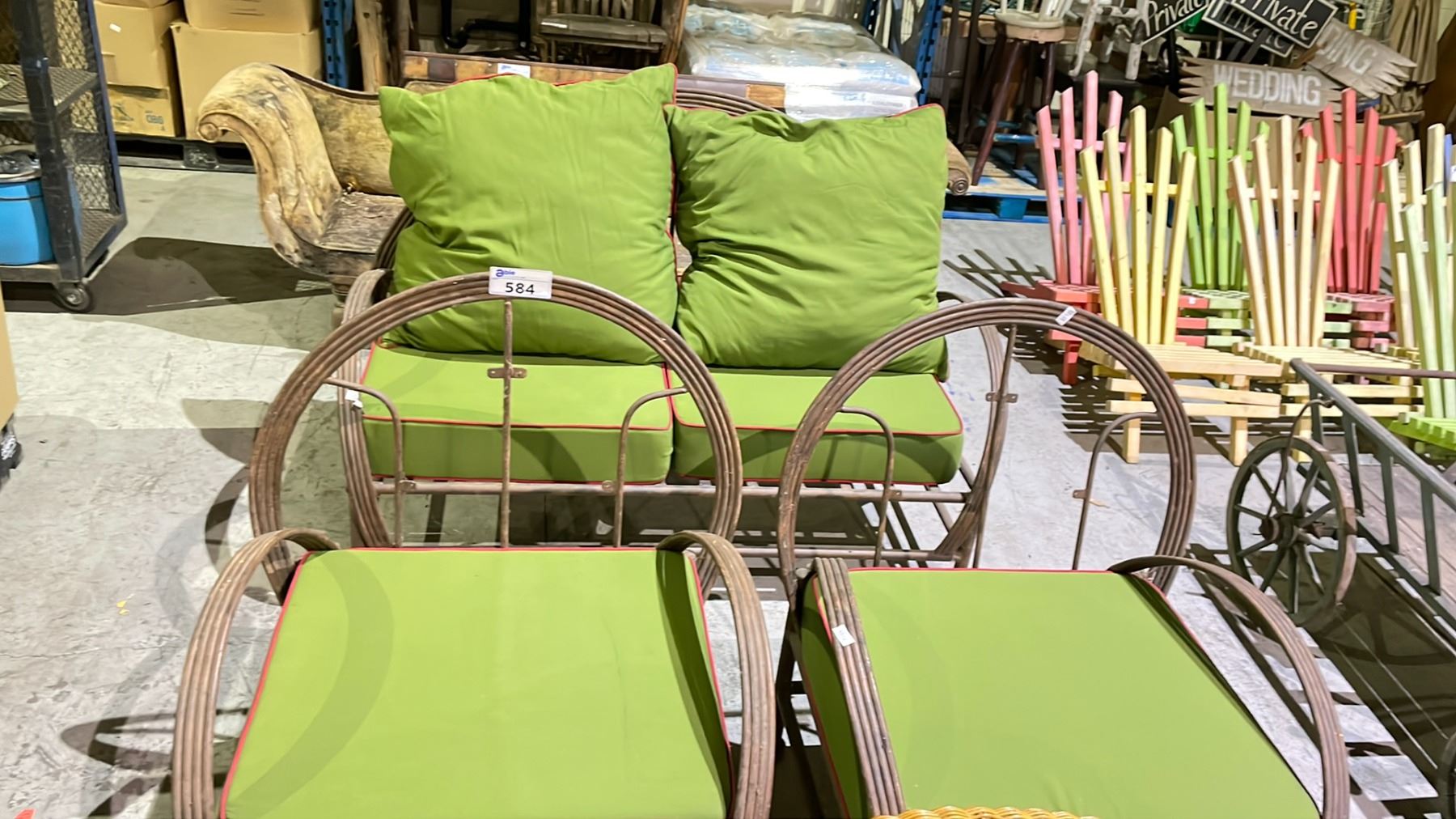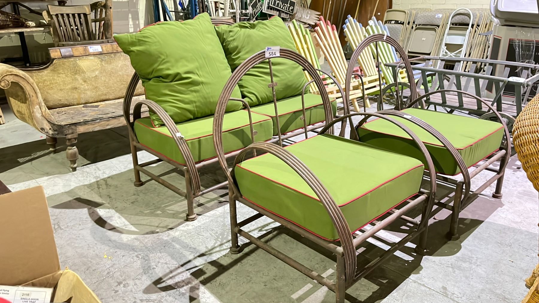 SET OF 2 WROUGHT IRON CHAIRS & LOVESEAT WITH CUSHIONS