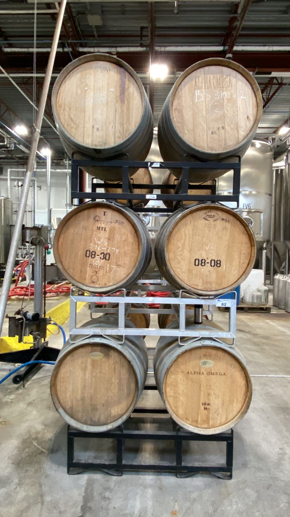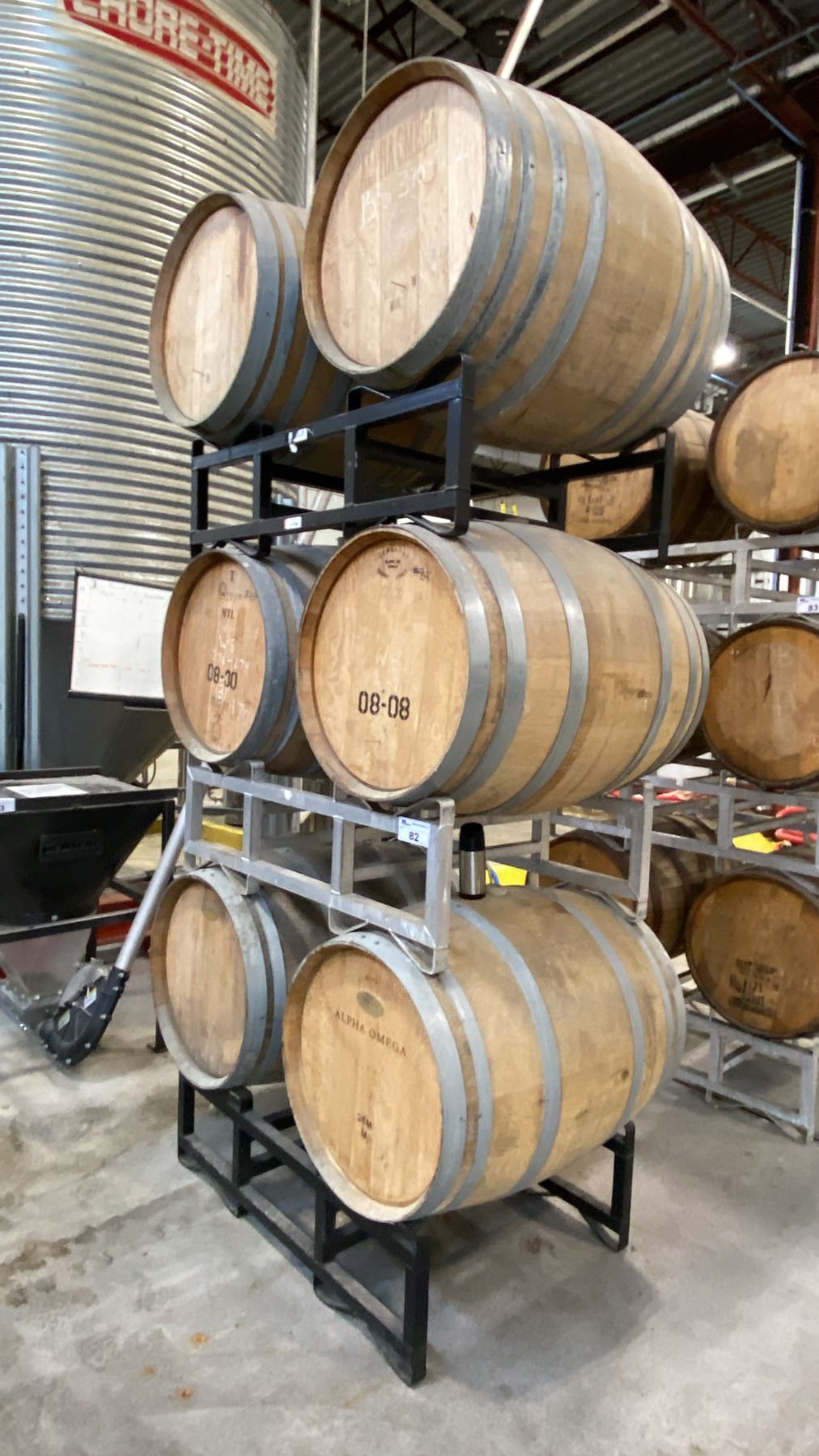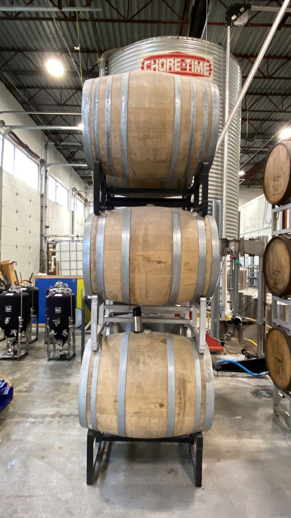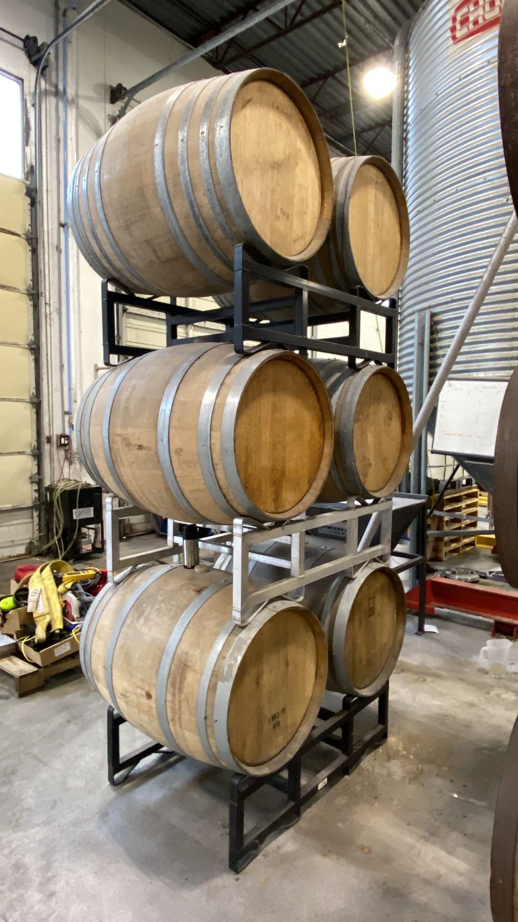 SET OF 3 CELLAR-TEK BARREL STANDS WITH (6) WOODEN BARRELS