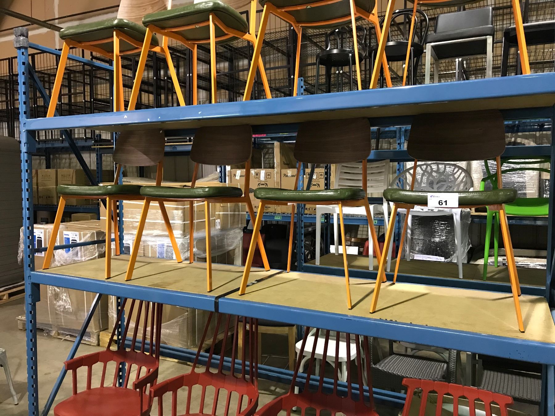 SET OF 4 CHAIRS WITH DARK WOOD BACK, DARK GREEN SEAT AND DEEP ORANGE BASE BISTRO CHAIRS