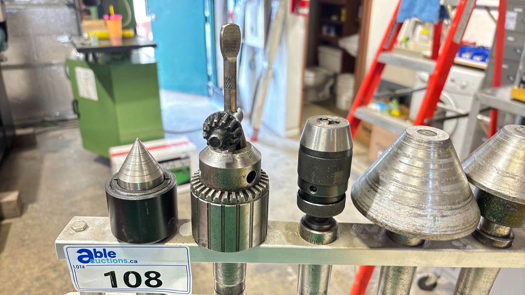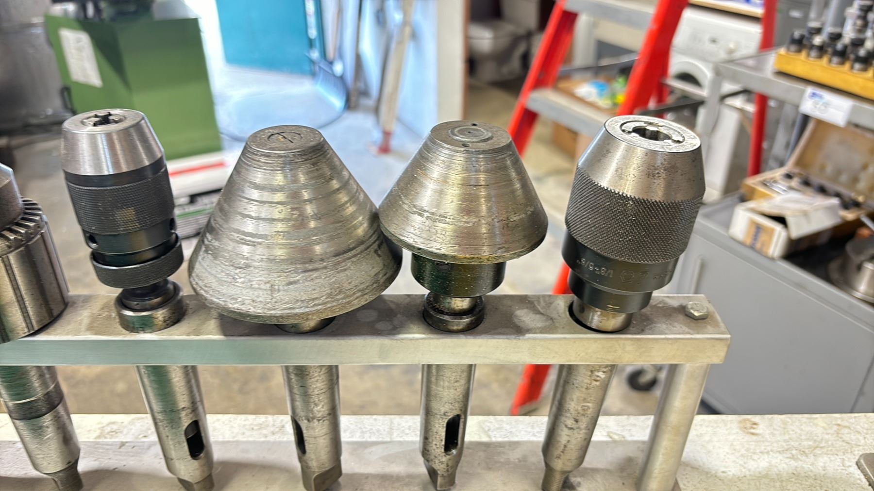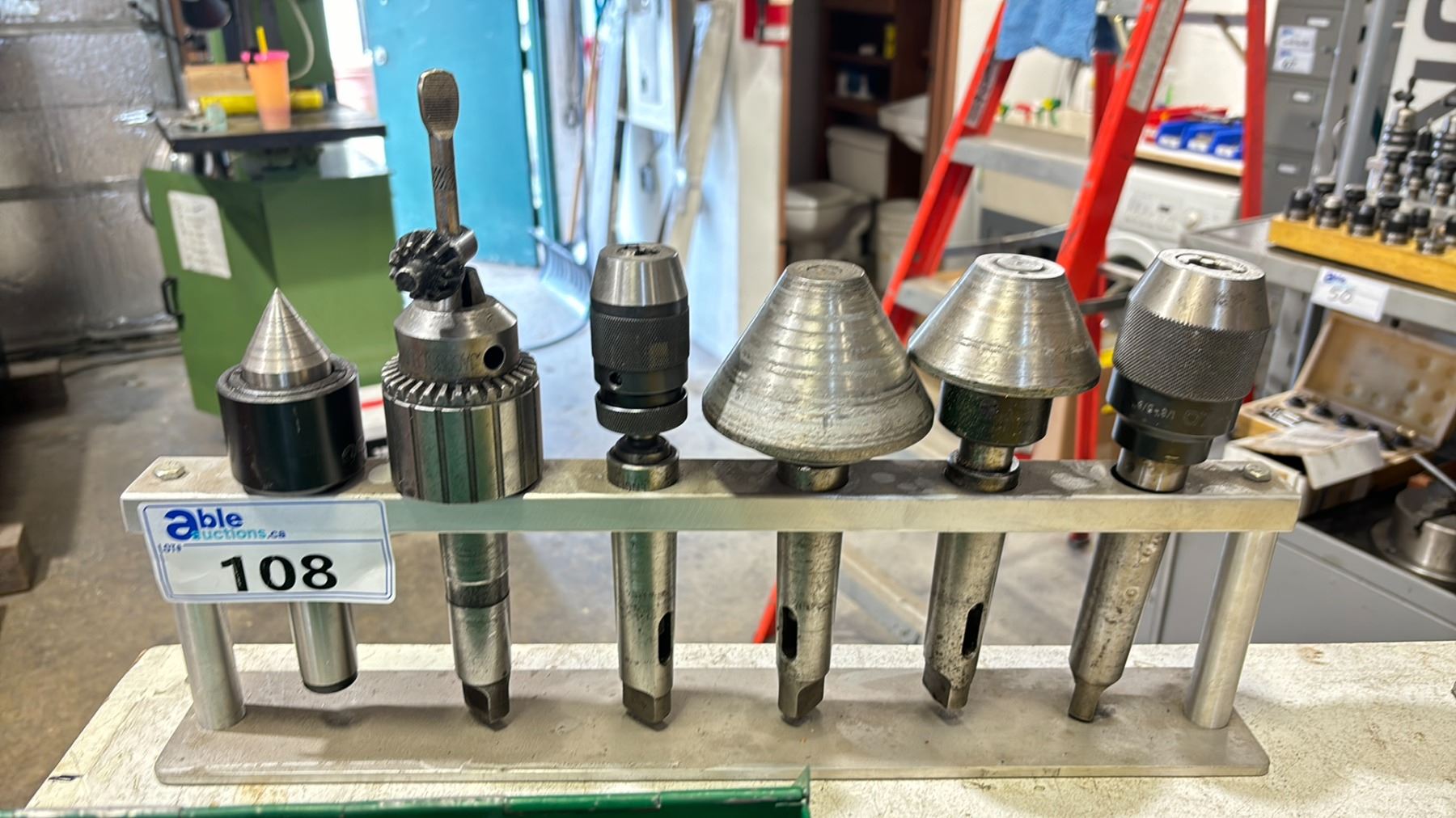 SET OF 6 LATHE TOOLING + STAND - LIVE CENTERS, KEYLESS CHUCKS & A JACOBS CHUCKS ON MORSE TAPER