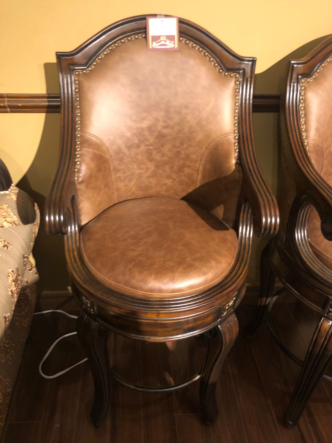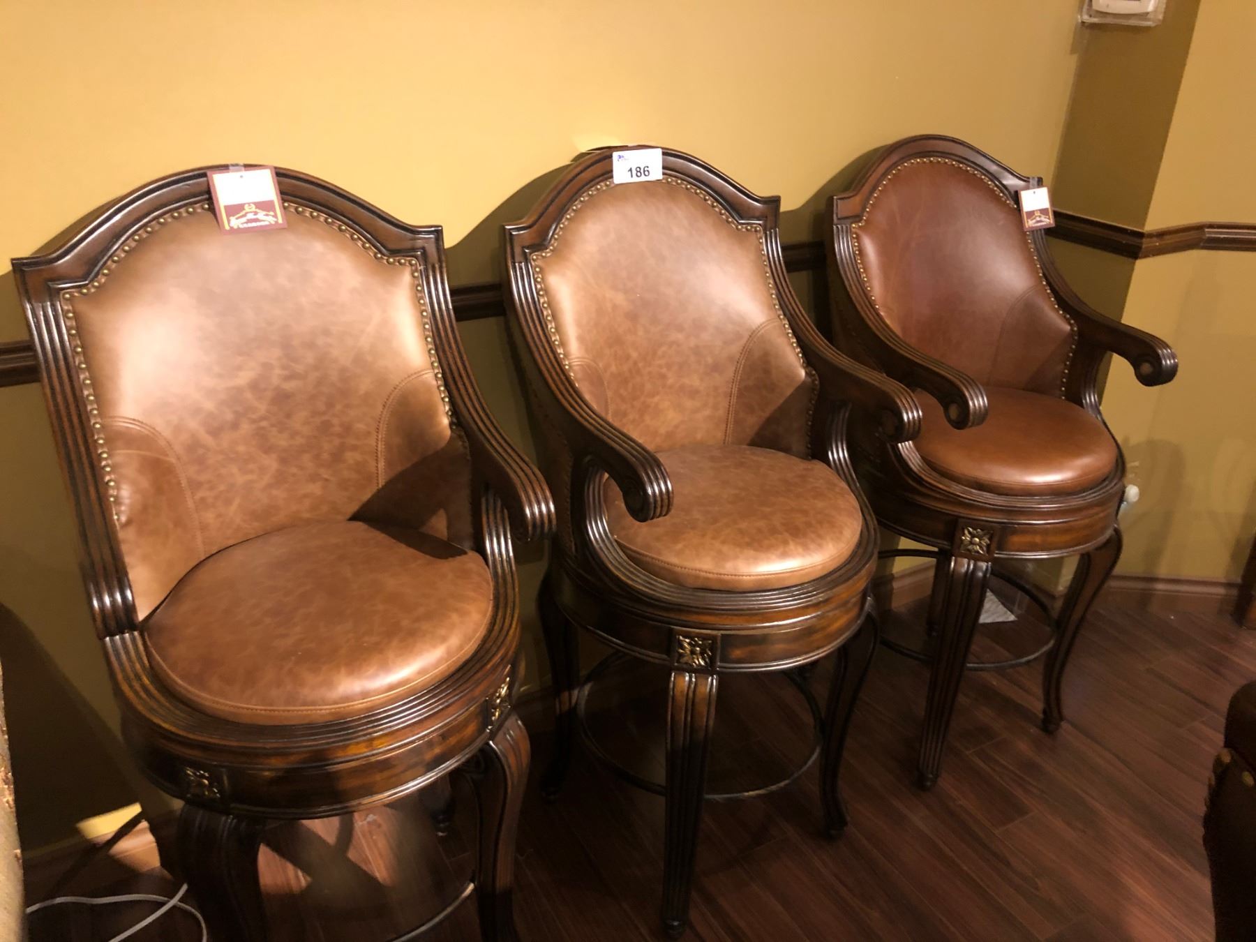 SET OF THREE BAR HEIGHT LEATHER / WOOD FRAME SWIVEL TOP BAR STOOLS. RETAIL $4,355.00