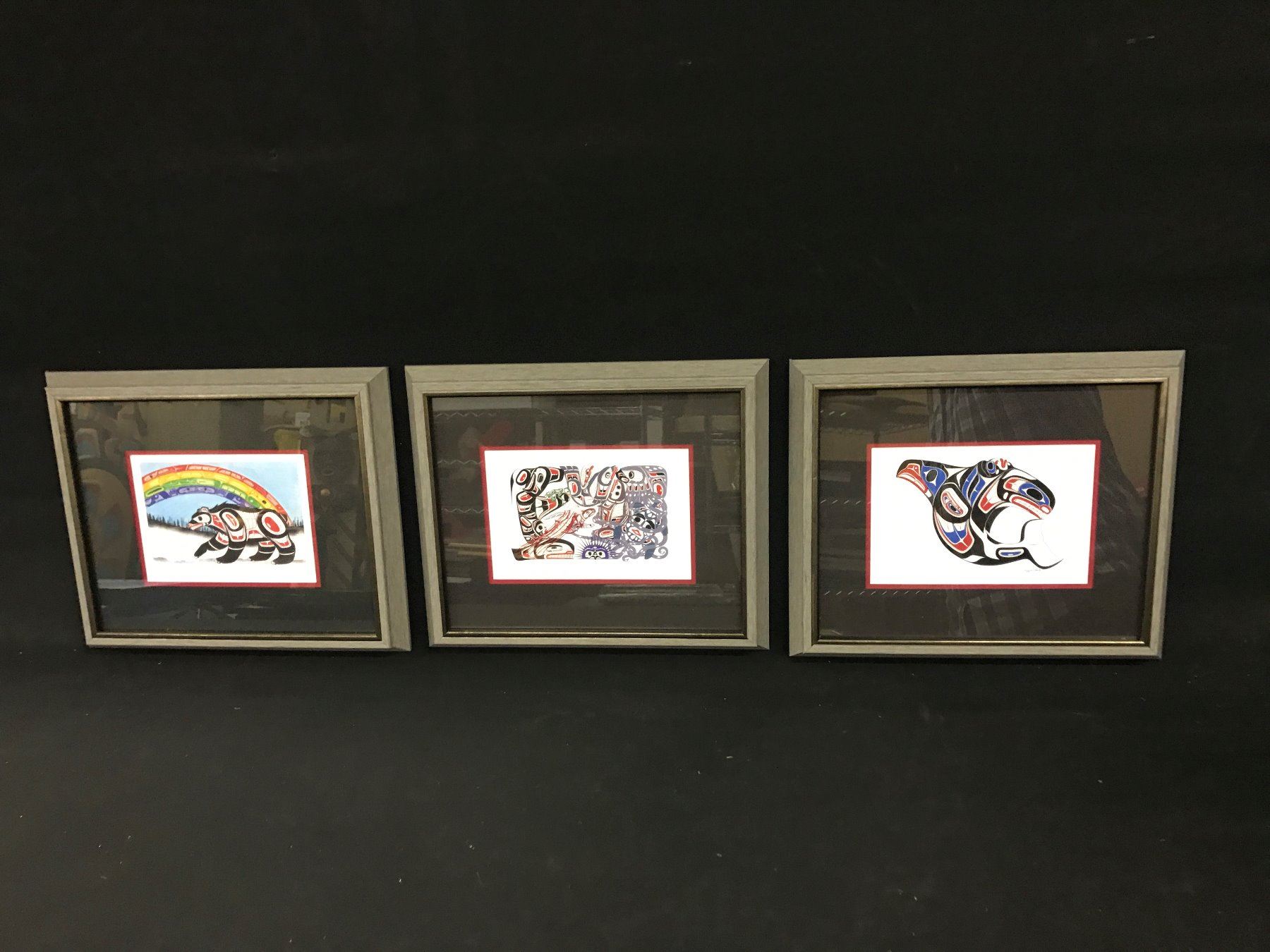 SET OF THREE FRAMED PRINTS BY NORTHERN TUCHONE NATION ARTIST RICHARD SHORTY. INCLUDES: 'KILLER WHALE DESIGN', 'OCEANIC' AND 'RAINBOW BEAR'