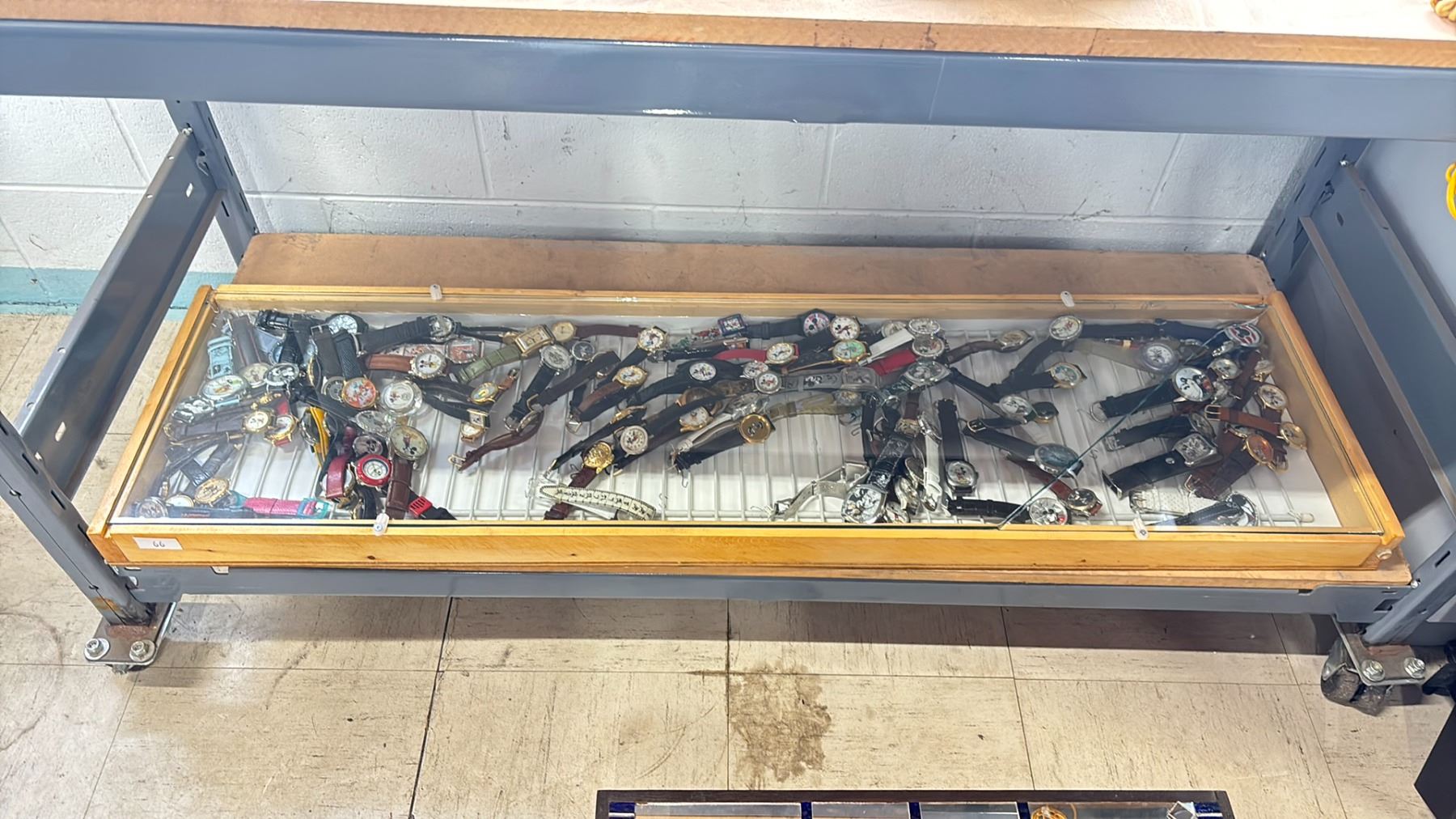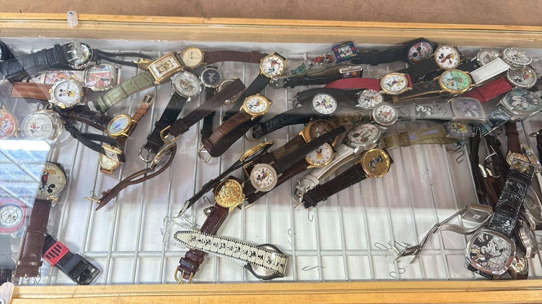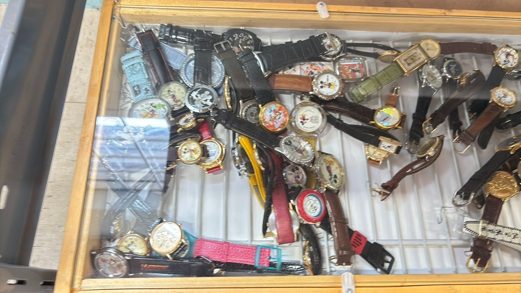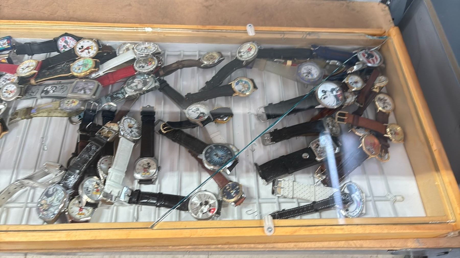 SHADOW BOX WITH ASSORTED DISNEY WATCHES *GLASS ON SHADOW BOX HAS A CRACK*