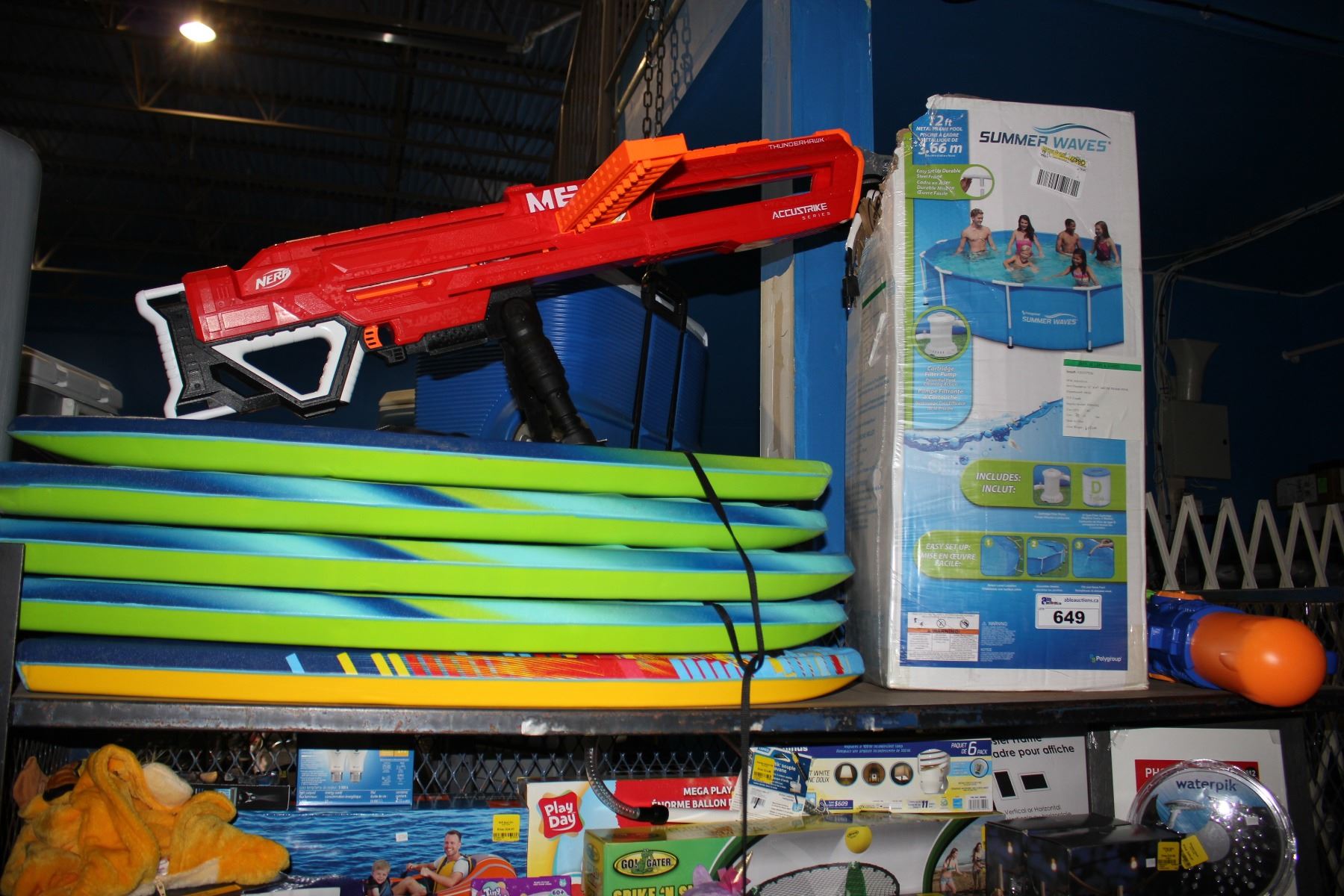SHELF INCLUDING 12' POOL, NERF GUN, BOOGIE BOARDS AND MORE