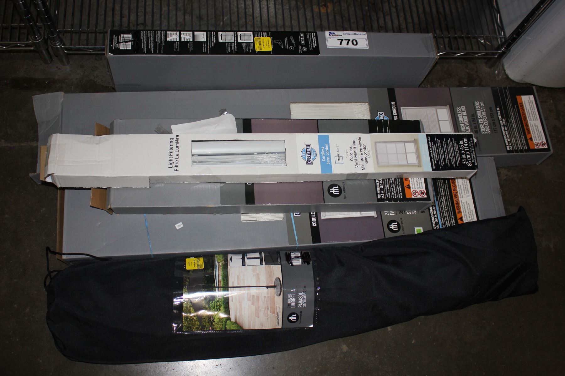 SHELF INCLUDING BLINDS AND 7' ROUND UMBRELLA