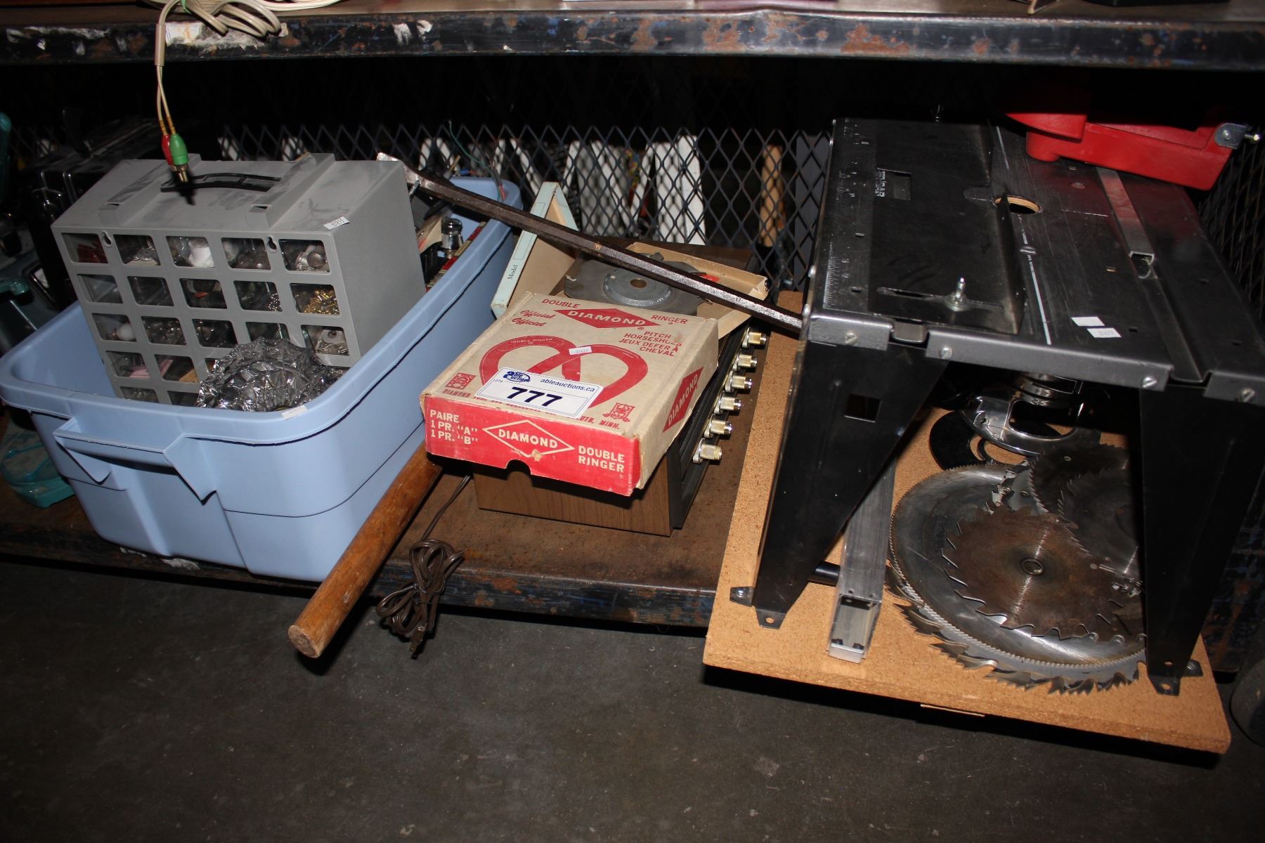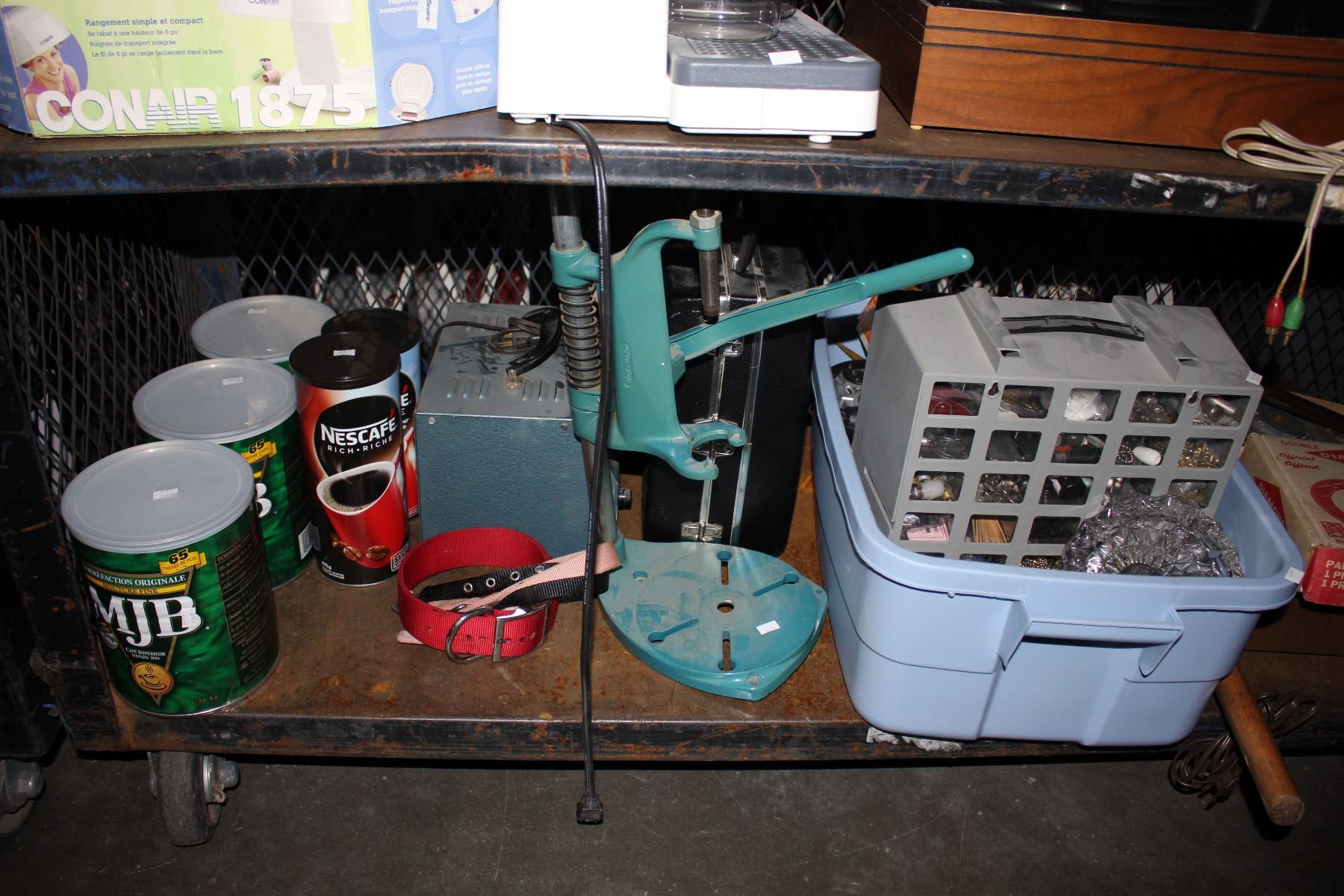 SHELF INCLUDING COFFEE, WINE CORKER, TABLE SAW WITH BLADES AND MORE