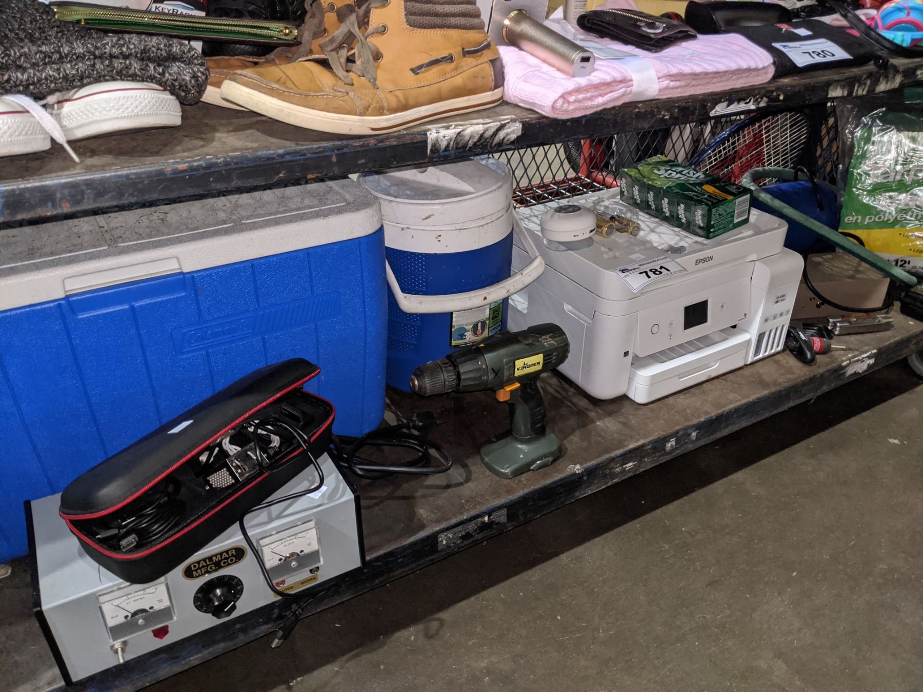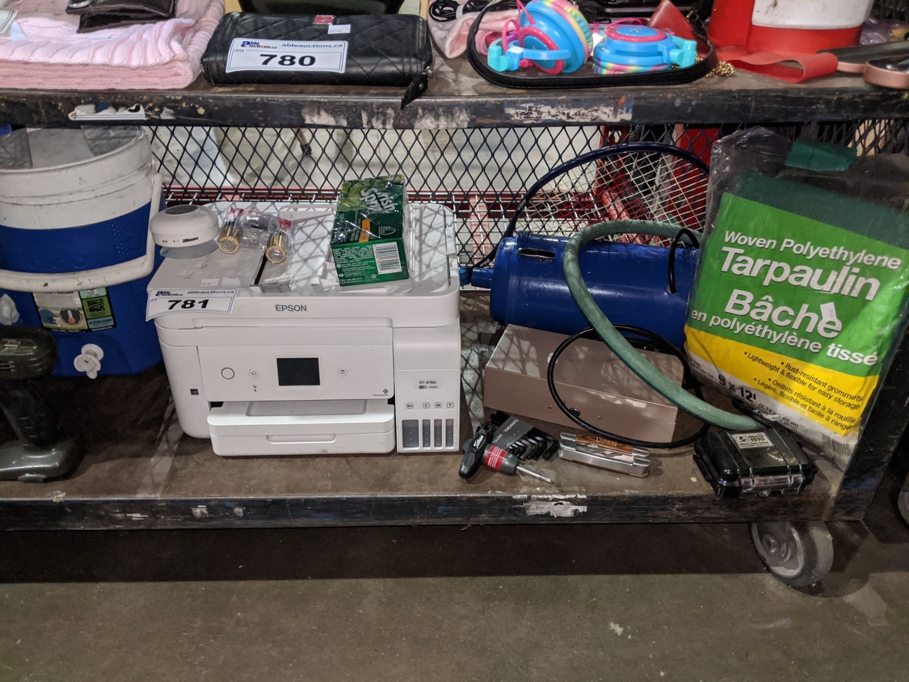 SHELF INCLUDING COOLERS, EPSON PRINTER, TARP, TOOLS AND MORE