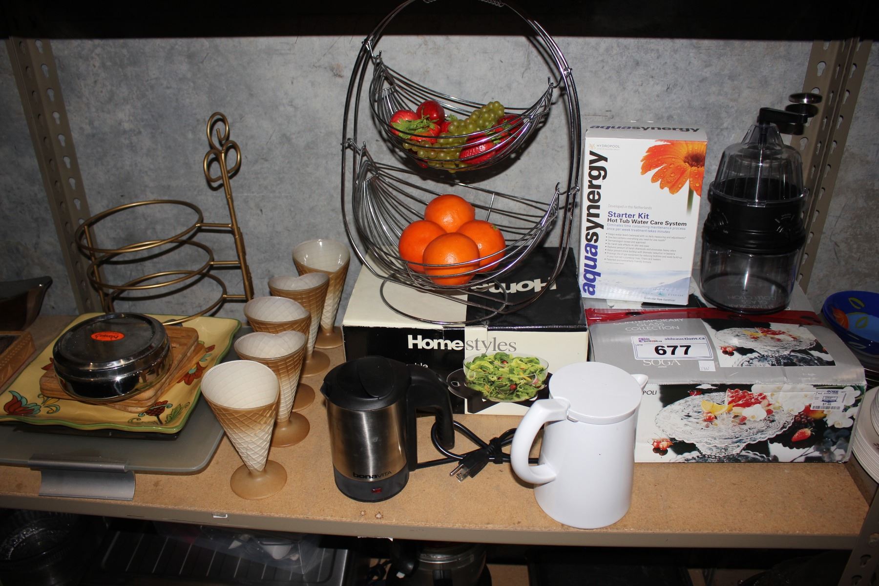 SHELF INCLUDING DISHWARE, HOT TUB CARE KIT, FOOD DISPLAYS AND MORE