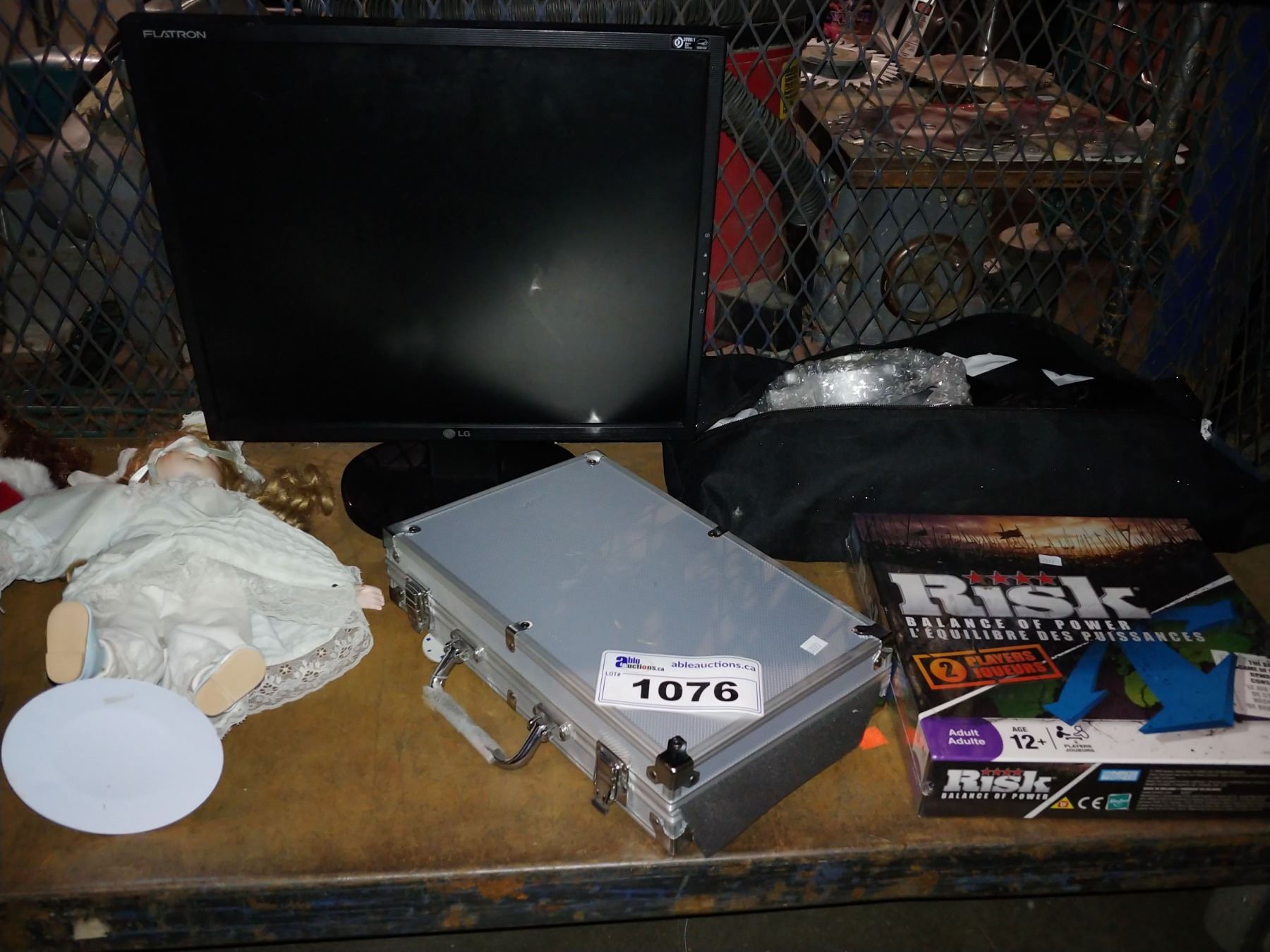 SHELF INCLUDING DOLLS, GAMES, MONITOR AND MORE