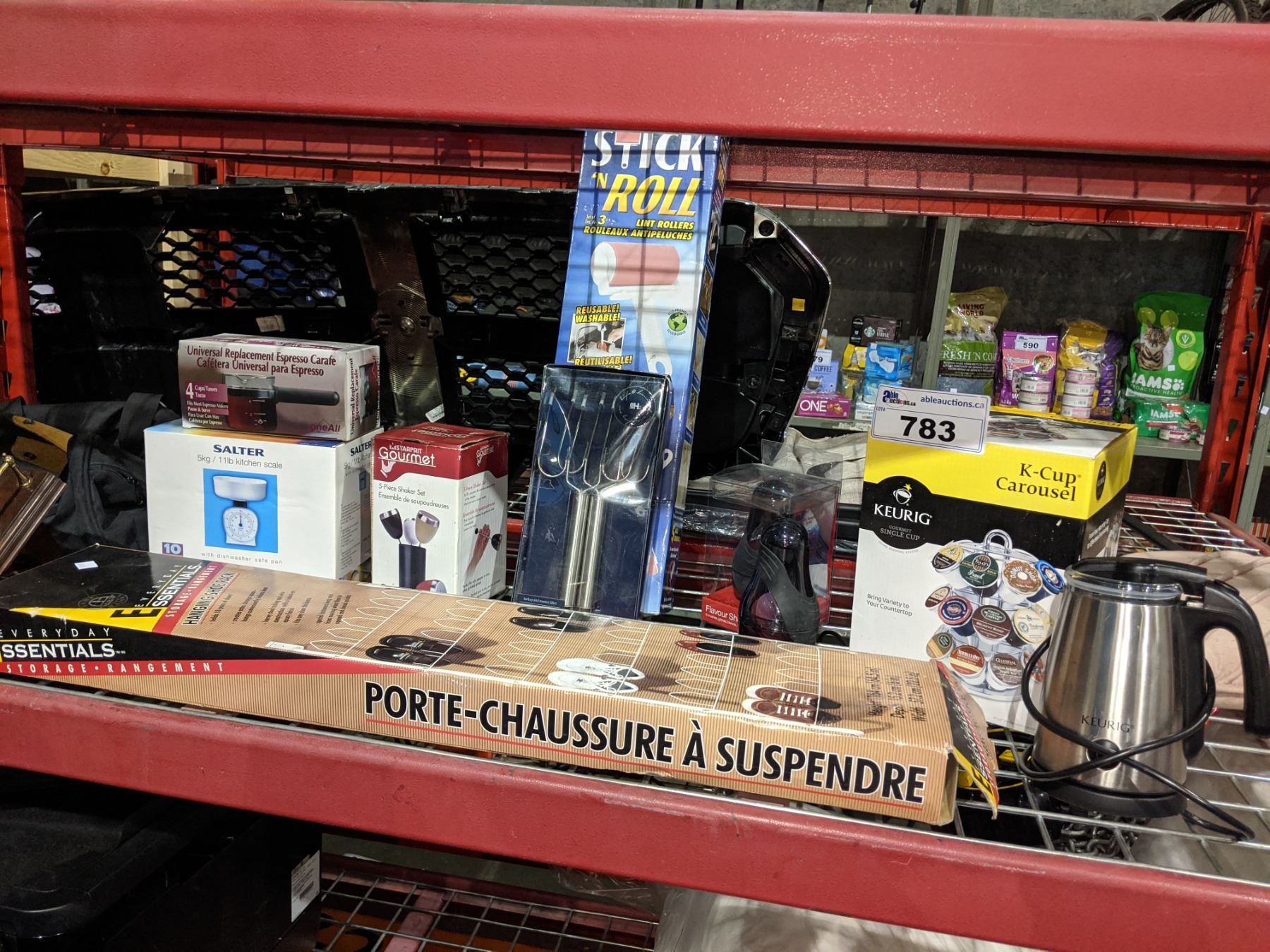 SHELF INCLUDING FLAVOUR SHAKERS, KEURIG CAROUSEL, SHOE RACK, KITCHEN ITEMS AND MORE