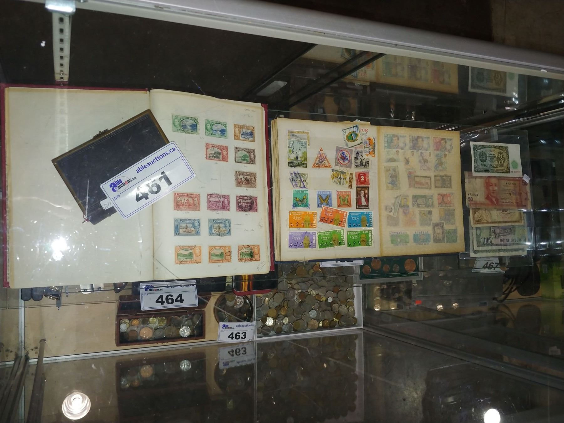SHELF INCLUDING FOREIGN CURRENCY, PAIR OF STAMP BOOKS AND MORE
