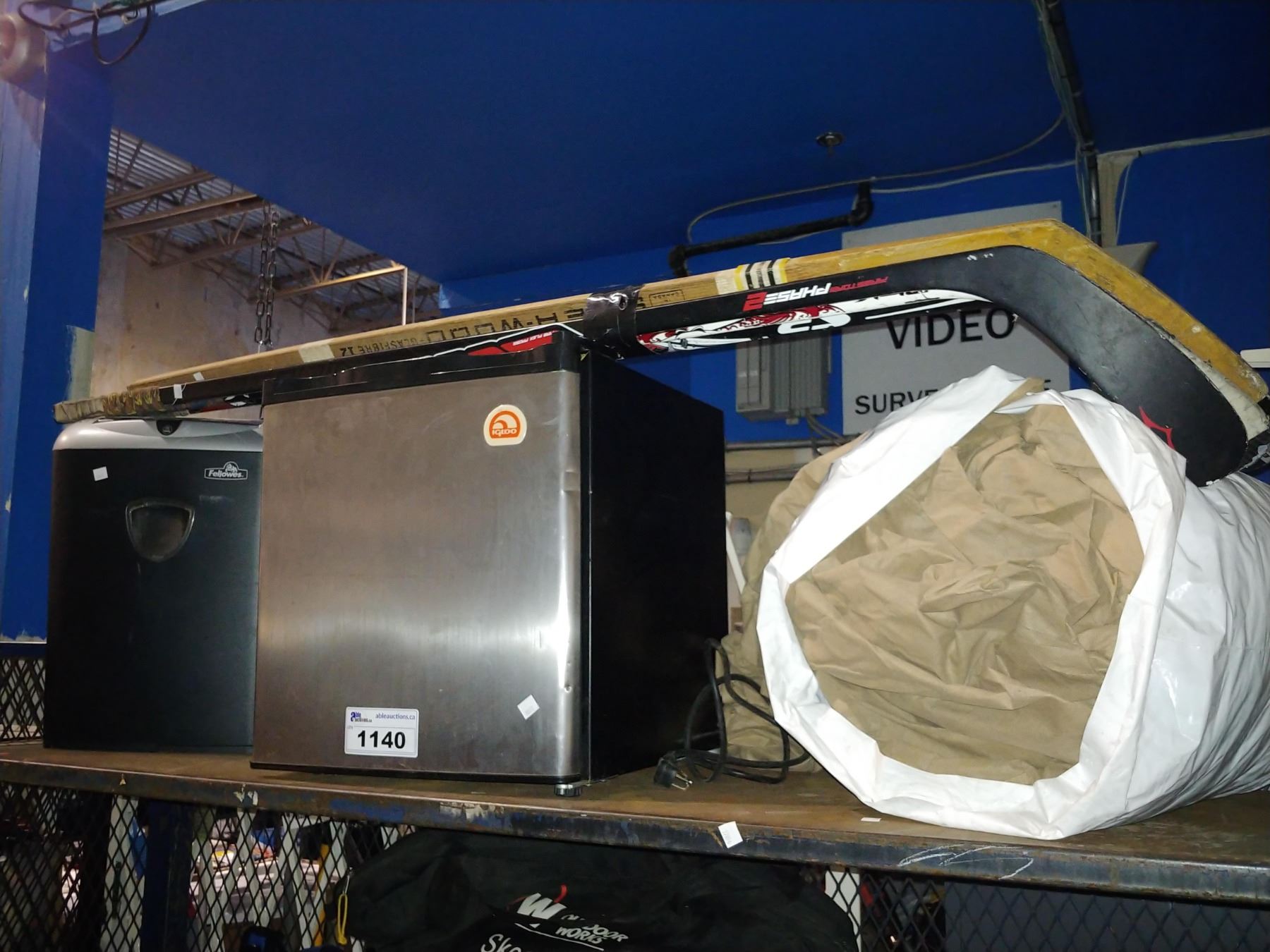 SHELF INCLUDING IGLOO MINI FRIDGE, TARP, SHREDDER, HOCKEY STICKS AND MORE