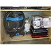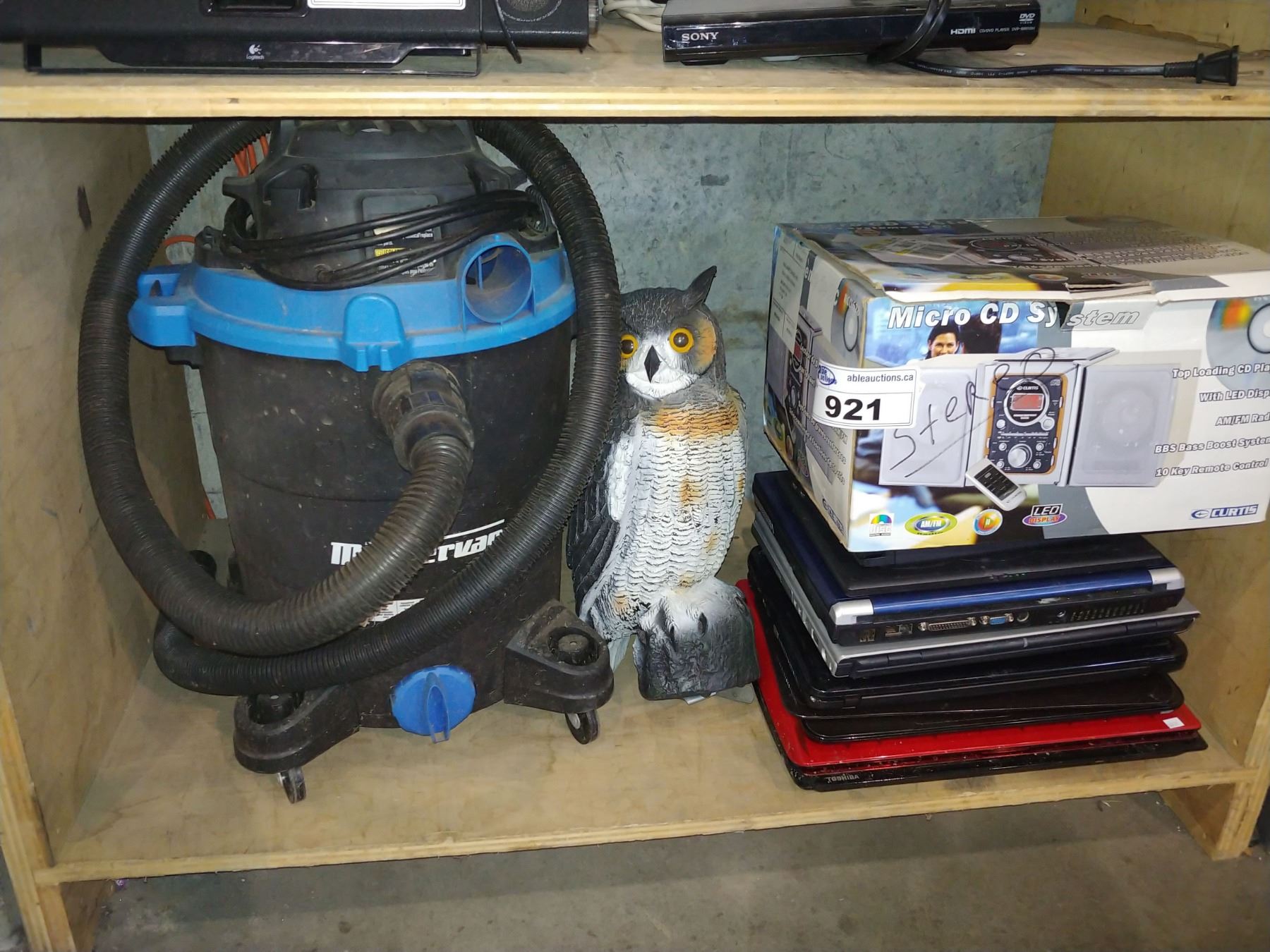 SHELF INCLUDING MASTERVAC, CD SYSTEM, OWL DECOY AND STACK OF LAPTOPS (NO HARD DRIVES)